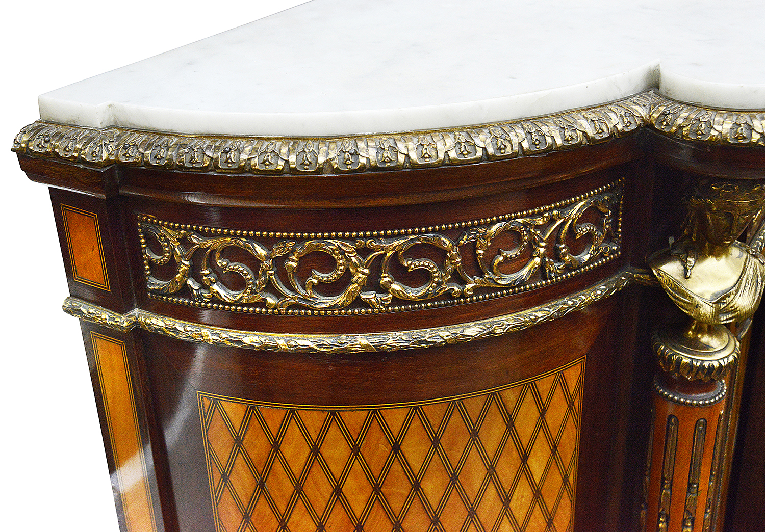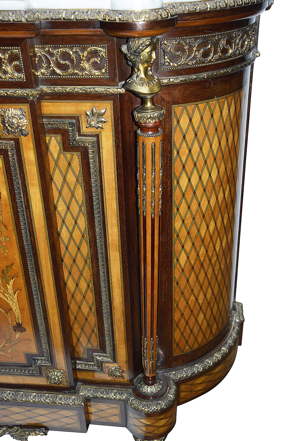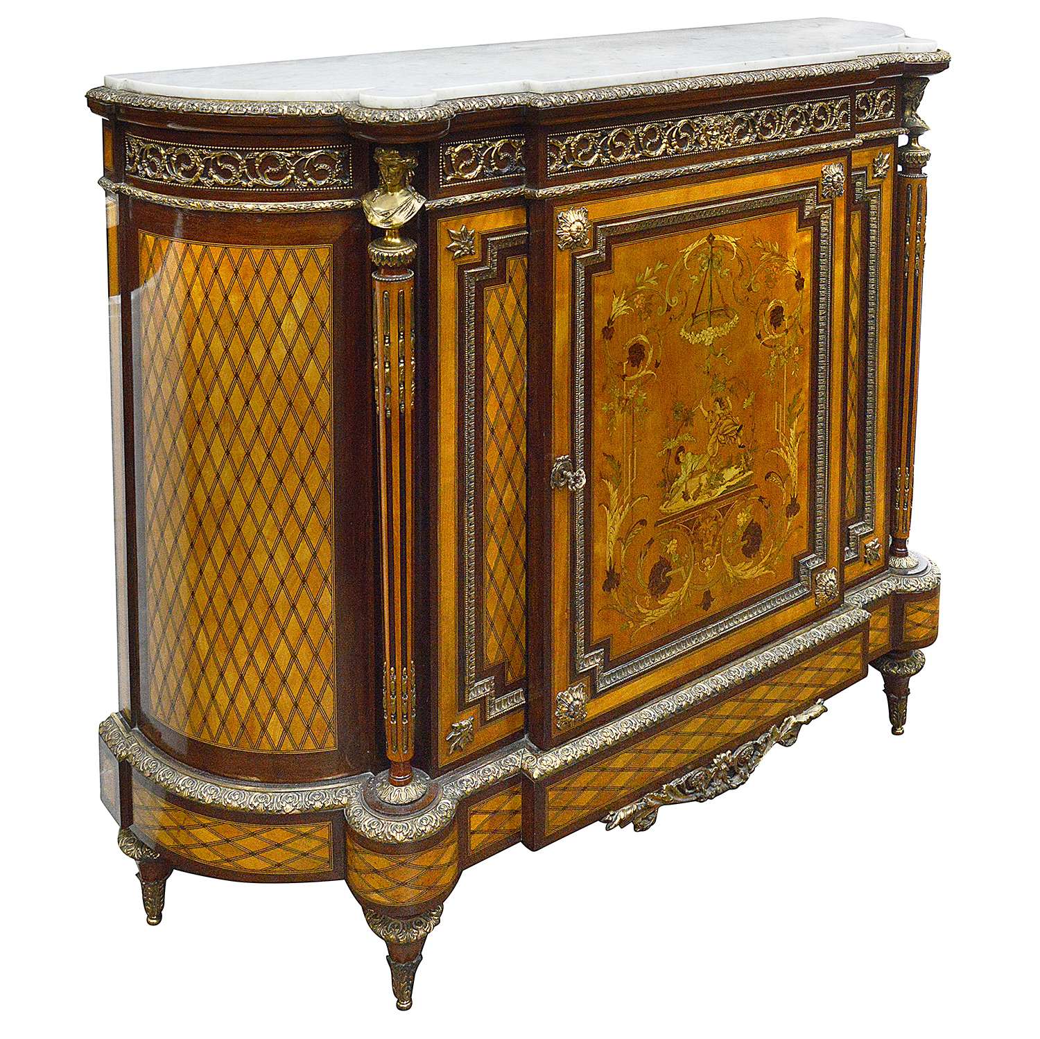 A fine quality late 19th Century French parquetry and marquetry inlaid Side cabinet. Have the original white marble top, trellis marquetry to the bowed sides, scrolling gilded ormolu mounts to the frieze, wonderful marquetry panel. to the central door, depicting lovers playing on a swing, surrounded by scrolling foliate and floral decoration. Turned tapering fluted columns to either side with Caryatids to the top. The door opening to reveal adjustable shelves within.