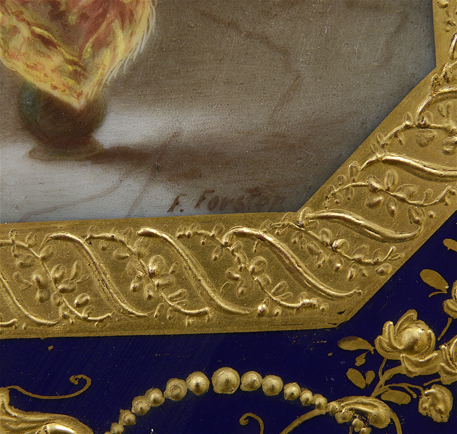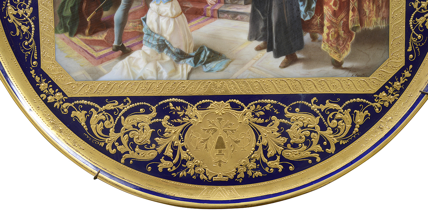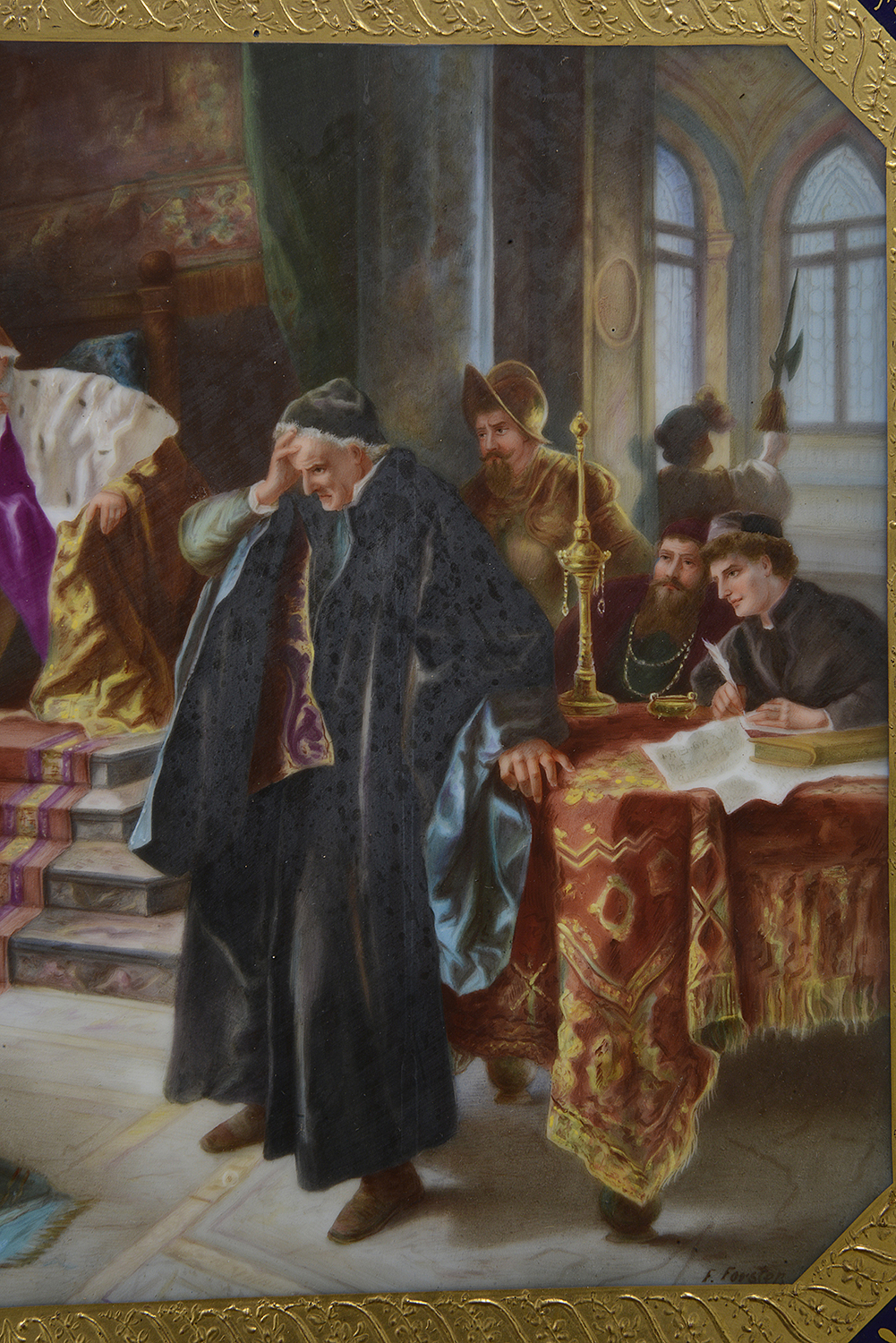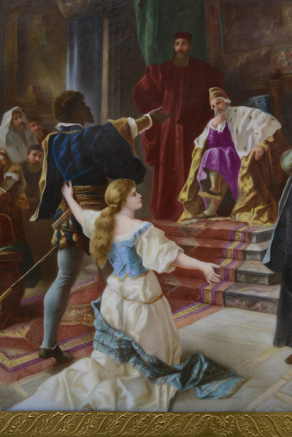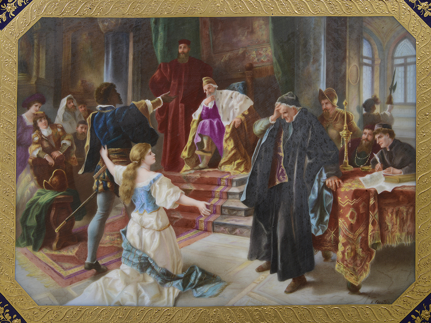 This late 19th-century Vienna porcelain charger beautifully illustrates a pivotal scene from Shakespeare's "Othello," depicting Othello addressing the Duke and Senate to justify his marriage to Desdemona. The vibrant colors and intricate detailing capture the drama of the moment, showcasing Othello’s noble stance amidst a gathering of intrigued figures. Surrounding him are richly dressed senators and attendants, each contributing to the scene's emotional weight. The ornate gold and cobalt blue border enhances the elegance of the piece, reflecting the opulence of Viennese porcelain craftsmanship. This charger serves as both a decorative object and a narrative expression of love and conflict.