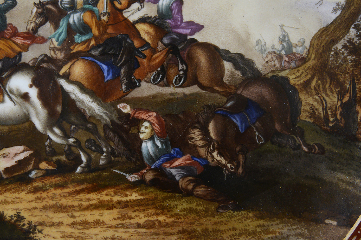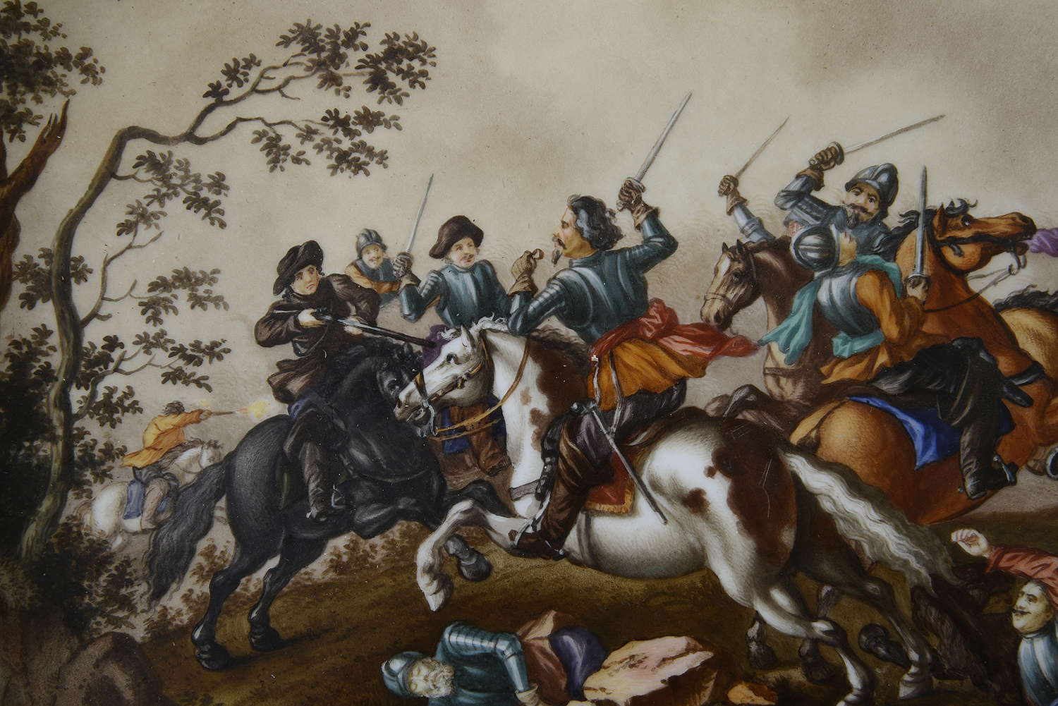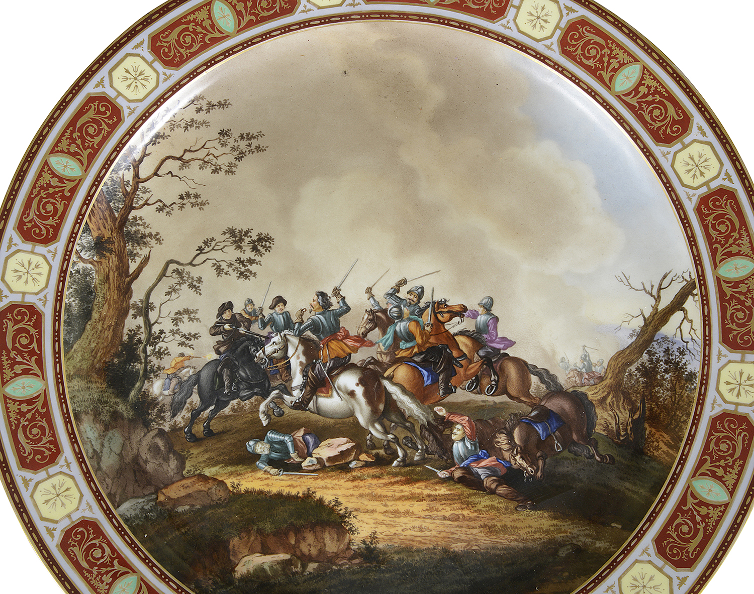 This late 19th century Vienna porcelain charger features a vibrant and dynamic scene of a cavalry battle. The central artwork depicts soldiers engaged in combat, mounted on richly adorned horses, highlighting the ferocity of the conflict. The meticulous detailing showcases the skill of the artist, with colorful uniforms and expressive facial features capturing the intensity of the moment. Surrounding the scene, the charger is adorned with an intricate border featuring floral motifs and geometric patterns, typical of the era's craftsmanship. This piece exemplifies the elegance and artistry of Vienna porcelain, merging historical narrative with exquisite decorative art.