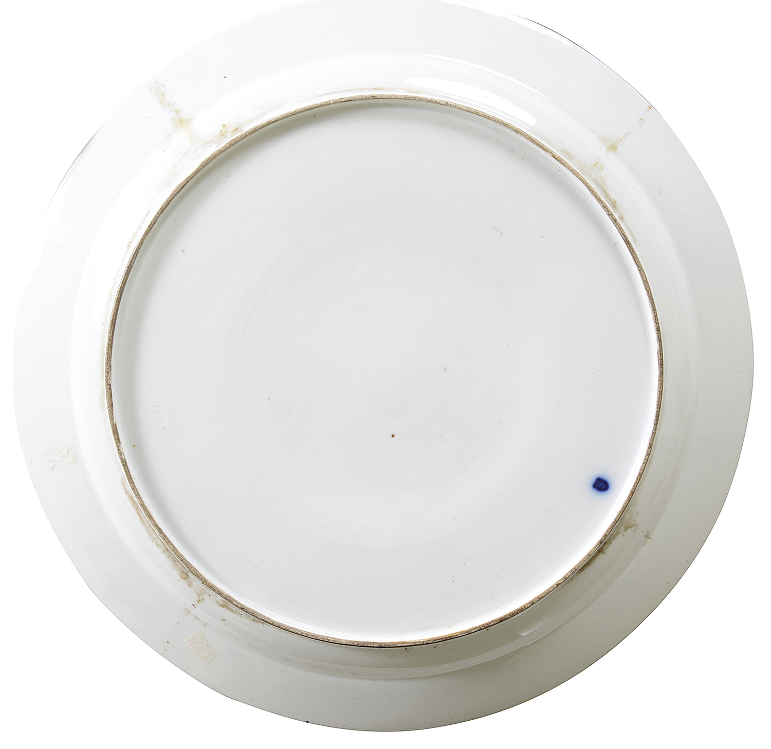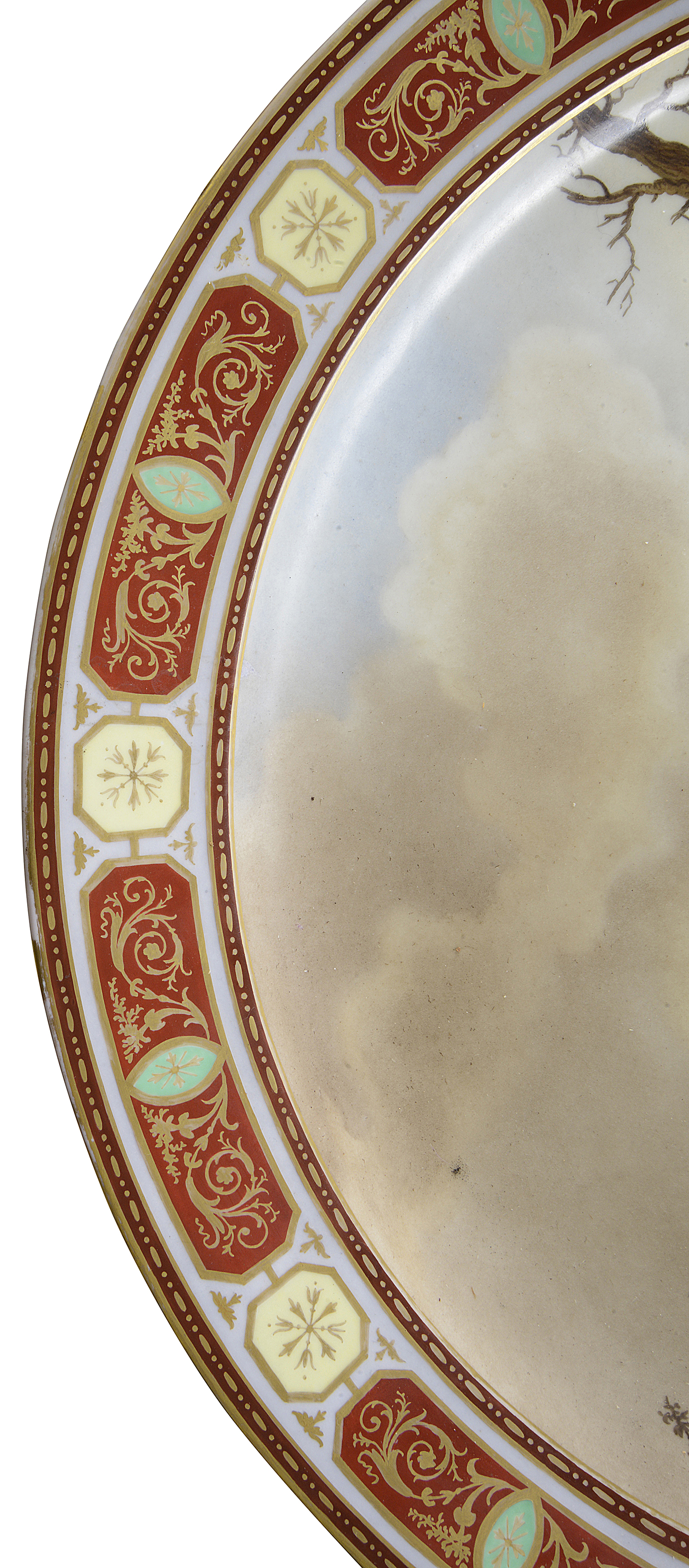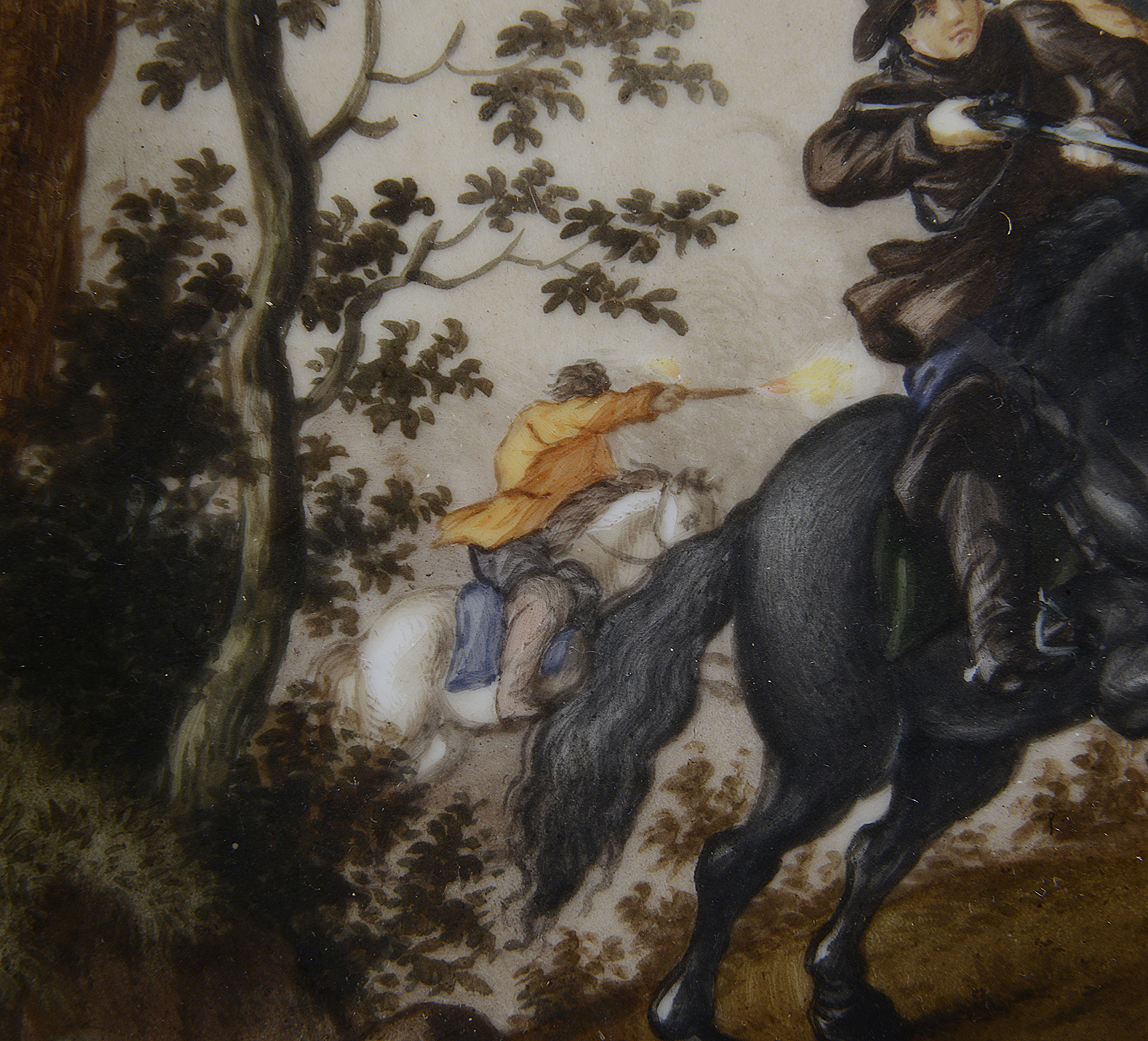 This late 19th century Vienna porcelain charger features a vibrant and dynamic scene of a cavalry battle. The central artwork depicts soldiers engaged in combat, mounted on richly adorned horses, highlighting the ferocity of the conflict. The meticulous detailing showcases the skill of the artist, with colorful uniforms and expressive facial features capturing the intensity of the moment. Surrounding the scene, the charger is adorned with an intricate border featuring floral motifs and geometric patterns, typical of the era's craftsmanship. This piece exemplifies the elegance and artistry of Vienna porcelain, merging historical narrative with exquisite decorative art.