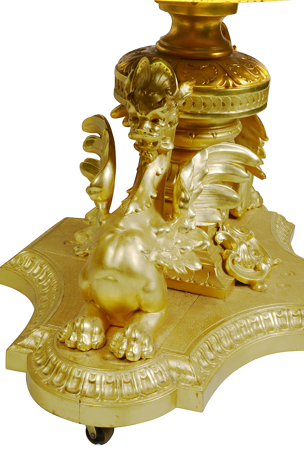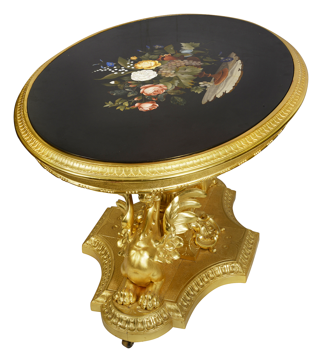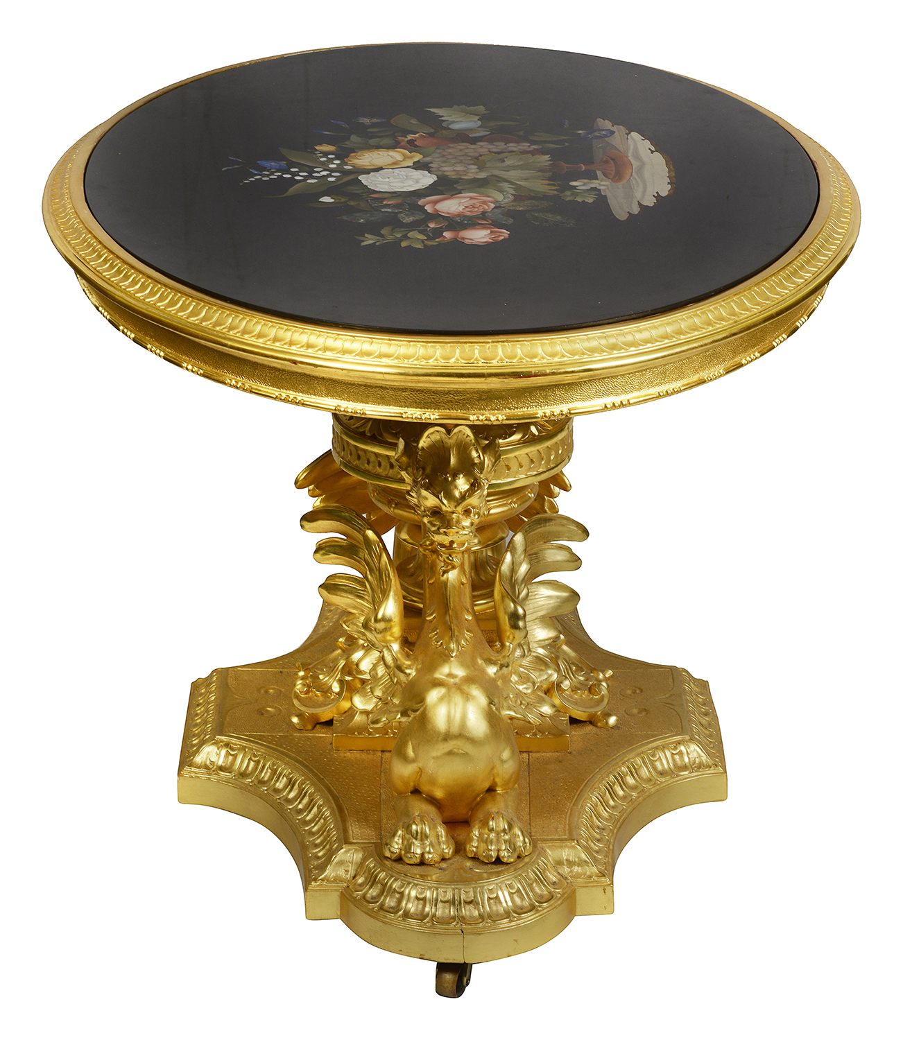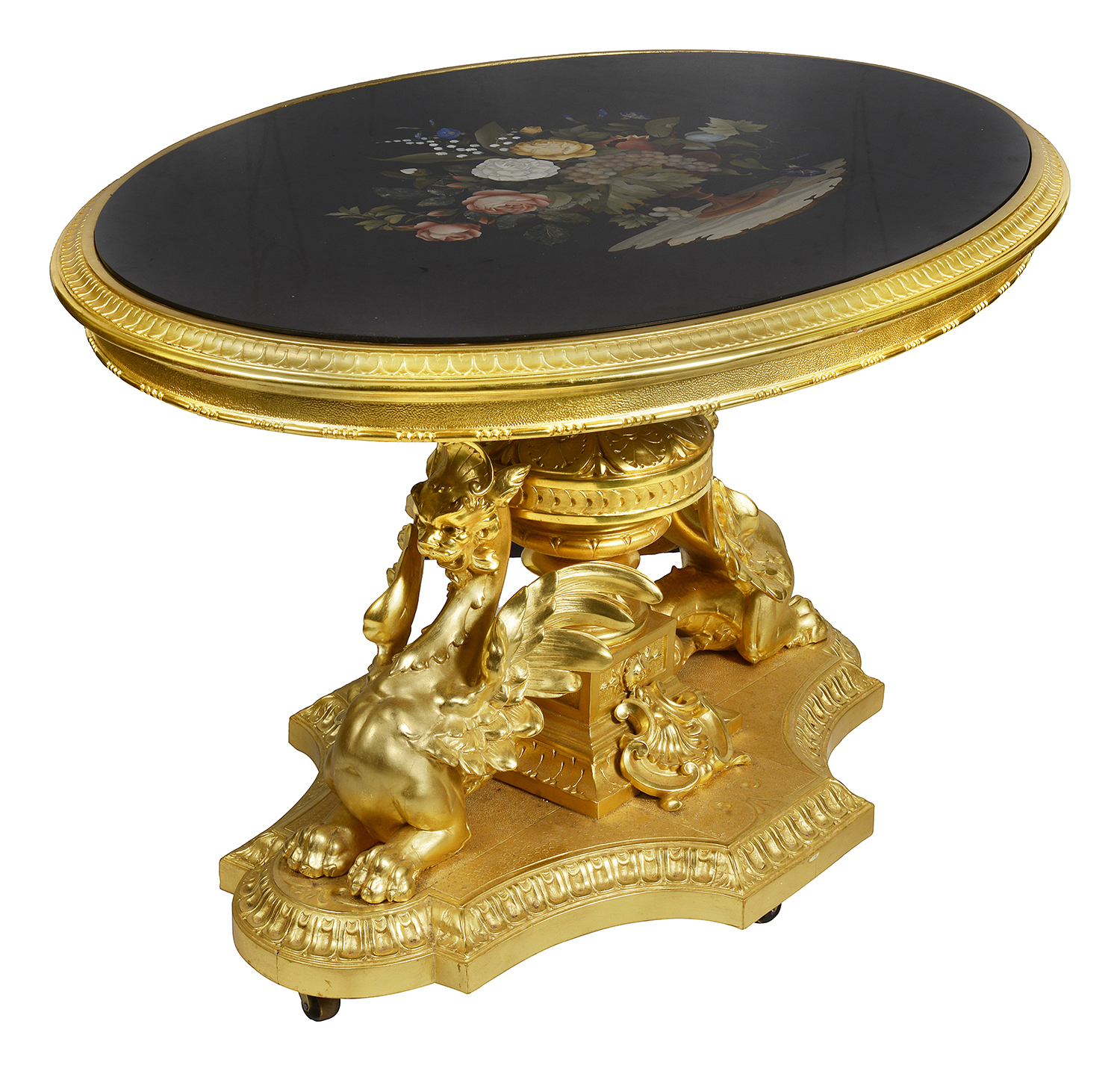 This exquisite Italian 19th-century centre table features a Florentine carved giltwood frame and stunning Pietra dura marble inlay top. The ornate design showcases intricate floral motifs, beautifully crafted in vibrant colours on a black marble surface. Supported by a pedestal adorned with two elegantly detailed, golden griffins, the table exudes opulence and artistry. The contrast between the dark marble and the rich gold enhances its luxurious appeal. Ideal for grand interiors, this piece exemplifies the craftsmanship of the period, merging functionality with striking aesthetics, making it a captivating focal point in any sophisticated setting.