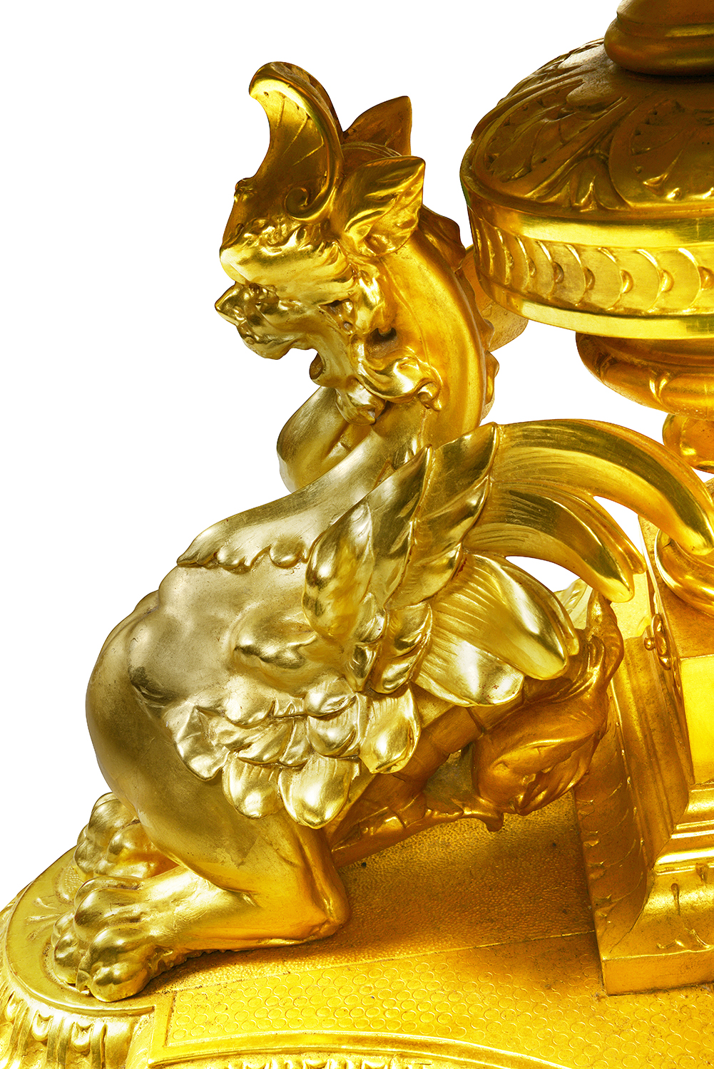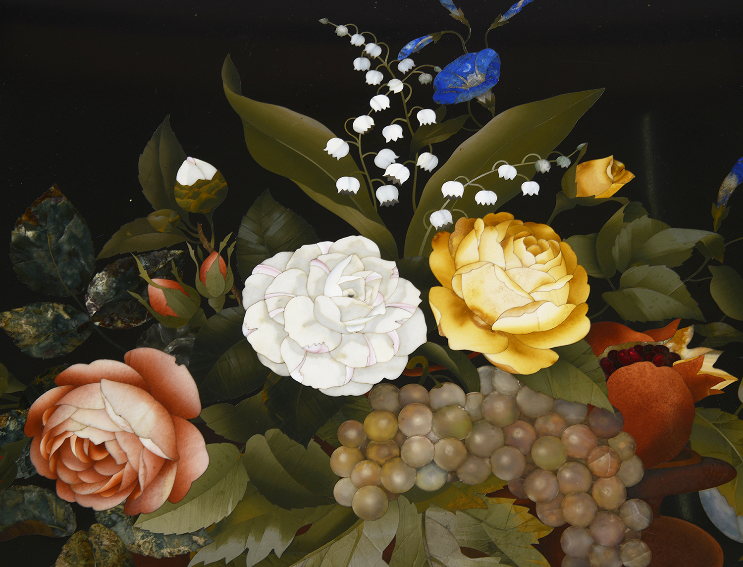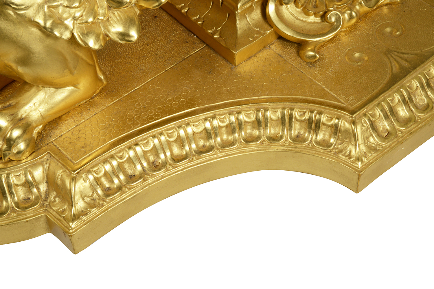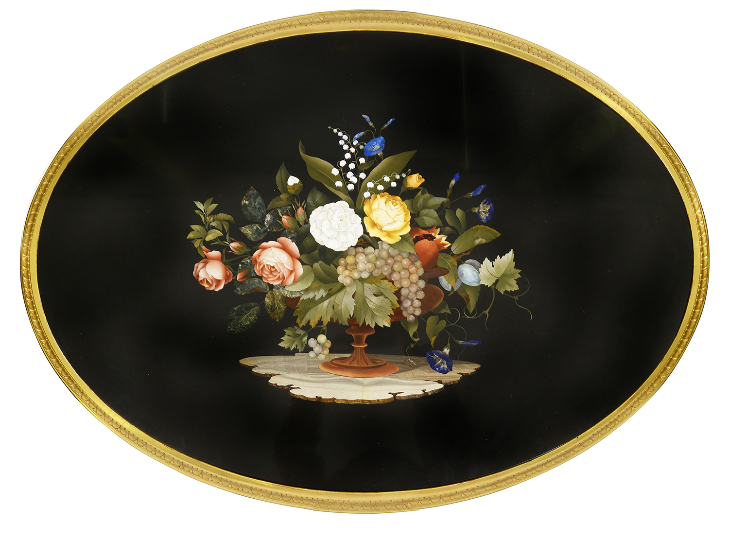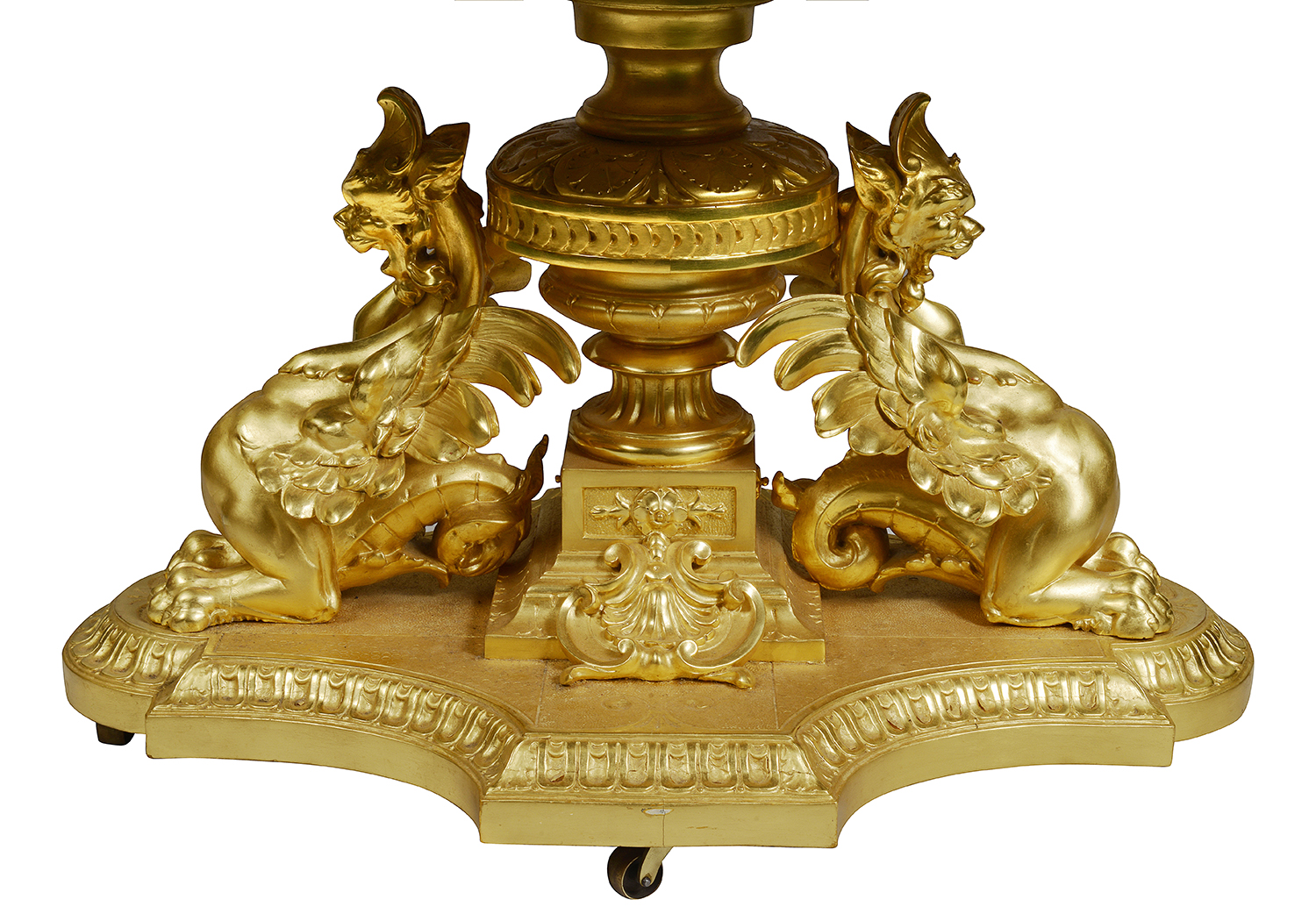 This exquisite Italian 19th-century centre table features a Florentine carved giltwood frame and stunning Pietra dura marble inlay top. The ornate design showcases intricate floral motifs, beautifully crafted in vibrant colours on a black marble surface. Supported by a pedestal adorned with two elegantly detailed, golden griffins, the table exudes opulence and artistry. The contrast between the dark marble and the rich gold enhances its luxurious appeal. Ideal for grand interiors, this piece exemplifies the craftsmanship of the period, merging functionality with striking aesthetics, making it a captivating focal point in any sophisticated setting.