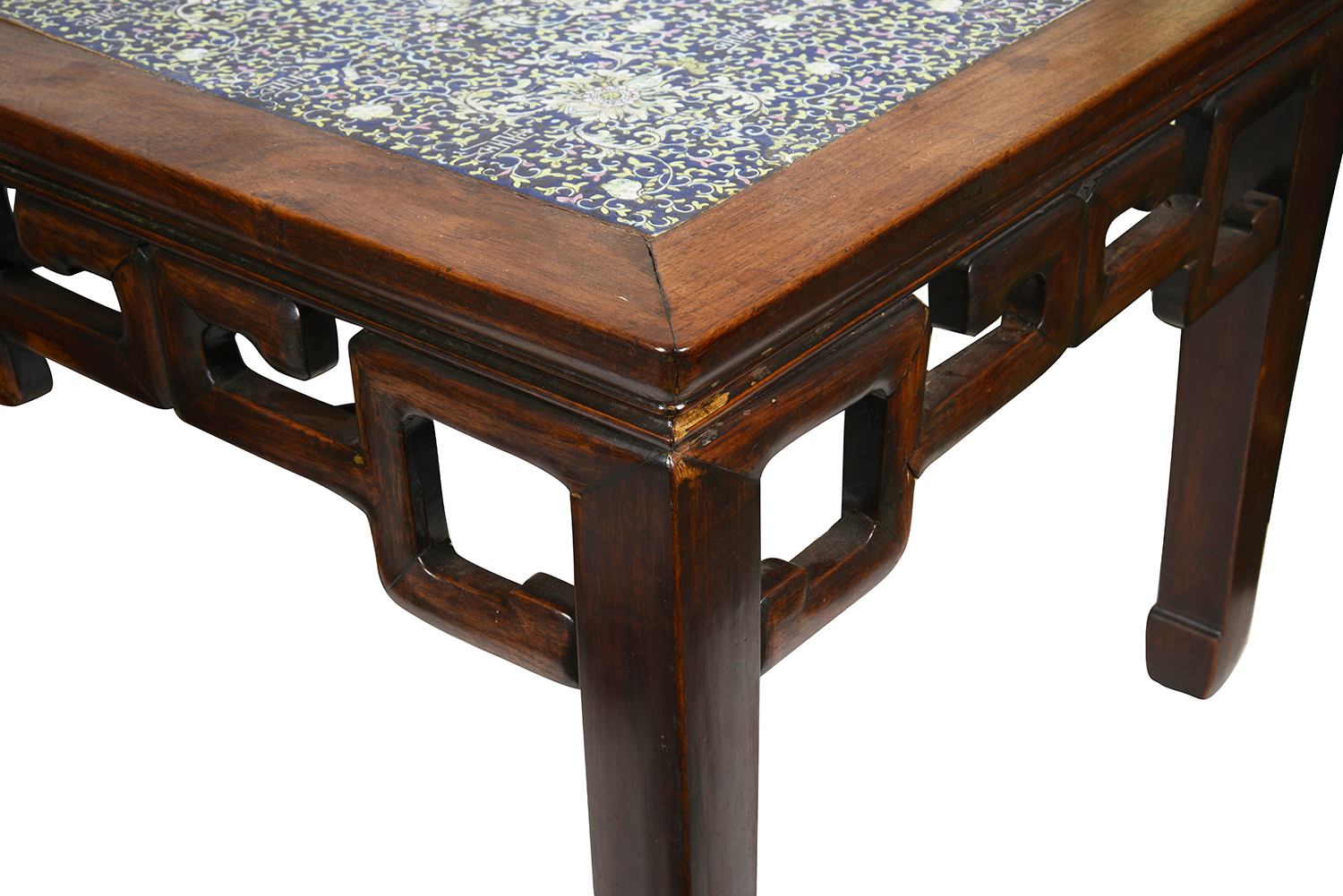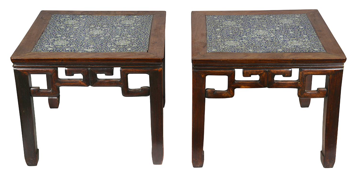 This exquisite pair of 19th-century Chinese hardwood stands is a stunning example of craftsmanship and artistry. Each stand features an inset Famille Rose porcelain panel, renowned for its vibrant colors and intricate floral designs. The hardwood construction showcases traditional Chinese joinery, emphasizing durability and elegance. The square tops are adorned with delicate porcelain, creating a harmonious contrast with the rich wood tones. The stands, with their gracefully curved legs and openwork sides, reflect the artistry of the period, making them not only functional furniture pieces but also captivating decorative elements that embody the beauty of Chinese culture.