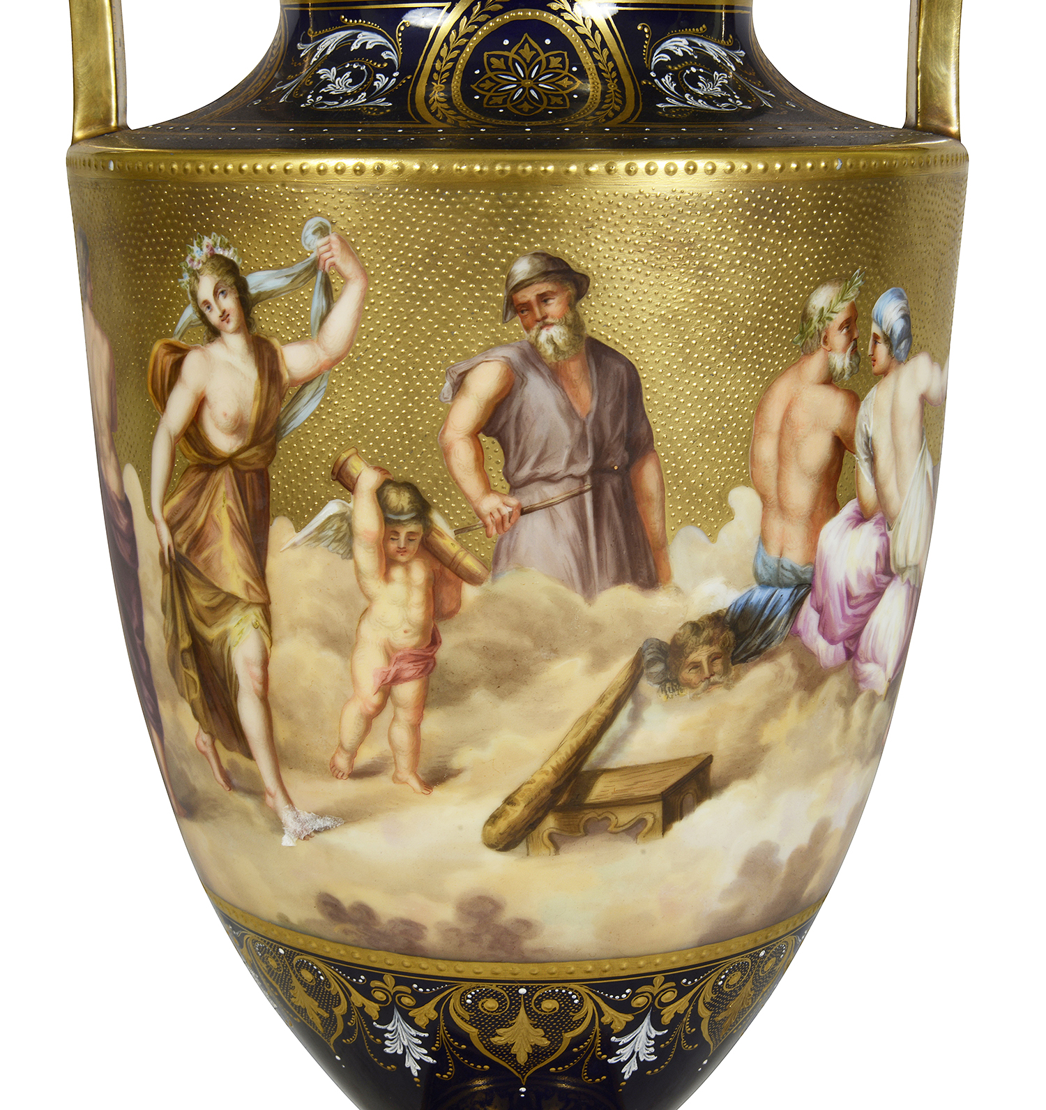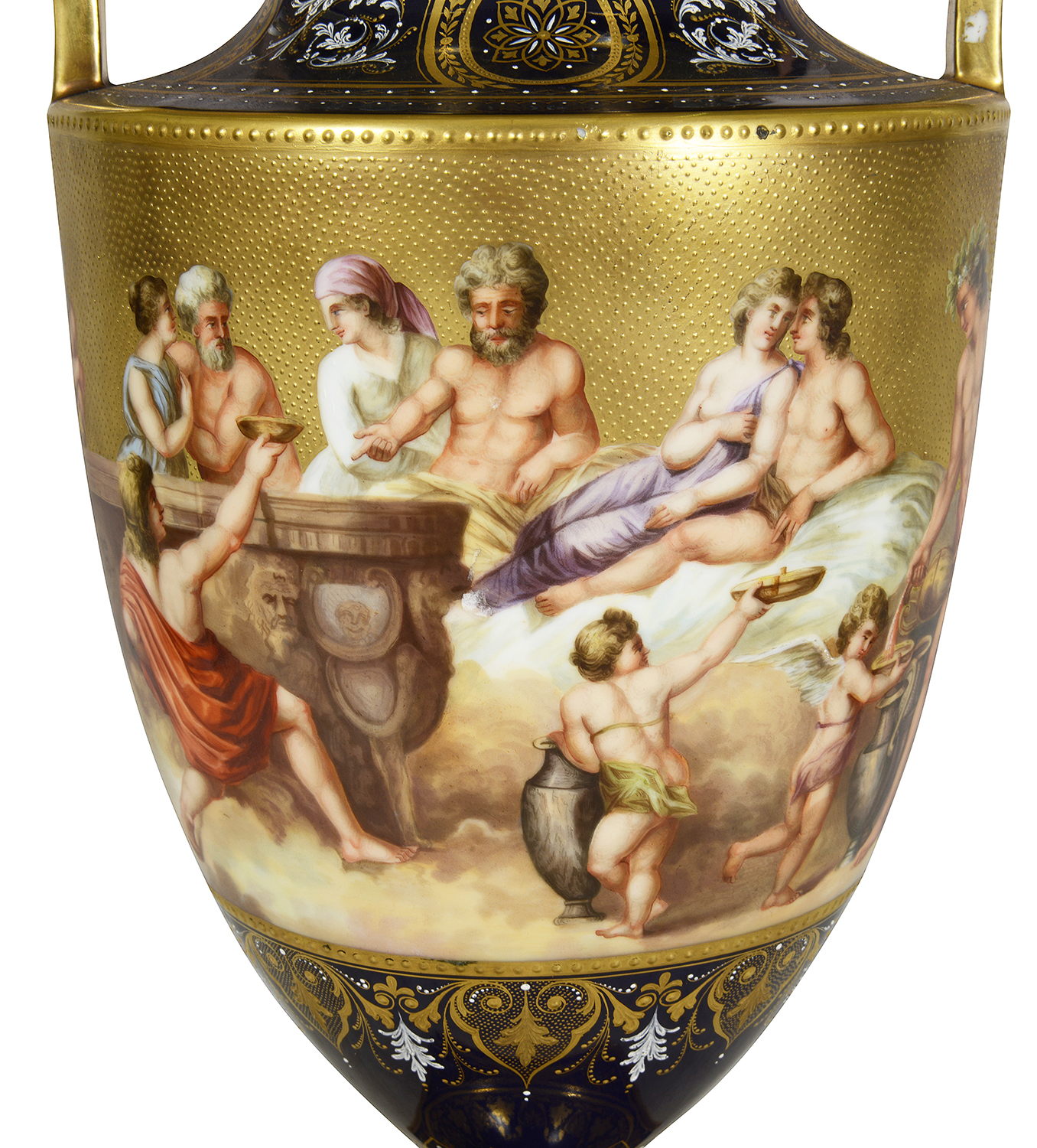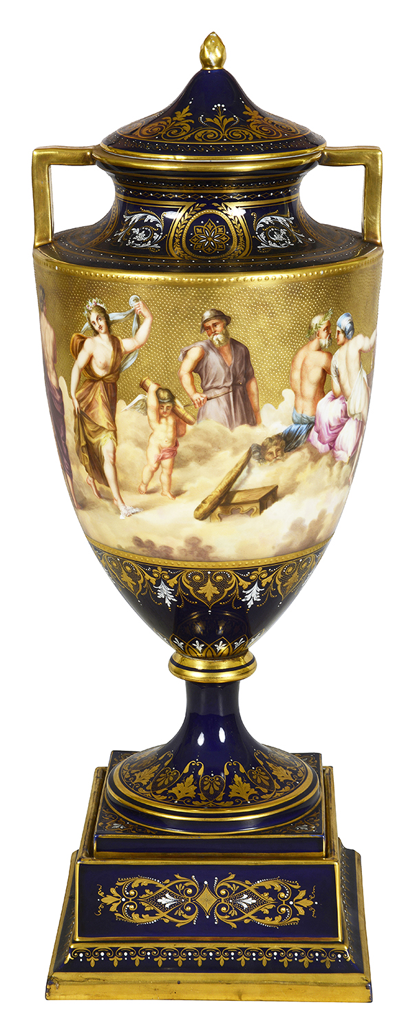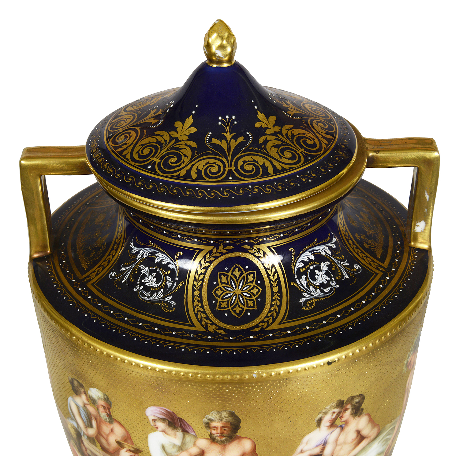 This exquisite late 19th-century Vienna porcelain lidded urn beautifully depicts “The Flourish of the Plagues of Thetis.” The urn features intricate hand-painted scenes of mythological figures, showcasing Thetis surrounded by other deities and nymphs, symbolizing both grace and turmoil. The vibrant colors, including deep blues and gold accents, enhance its elegance. The detailed artistry reflects the craftsmanship of the Vienna porcelain makers, capturing the duality of beauty and suffering inherent in the myth. With its ornate handles and a finely crafted lid, this urn serves as a stunning testament to the artistic achievements of its era.