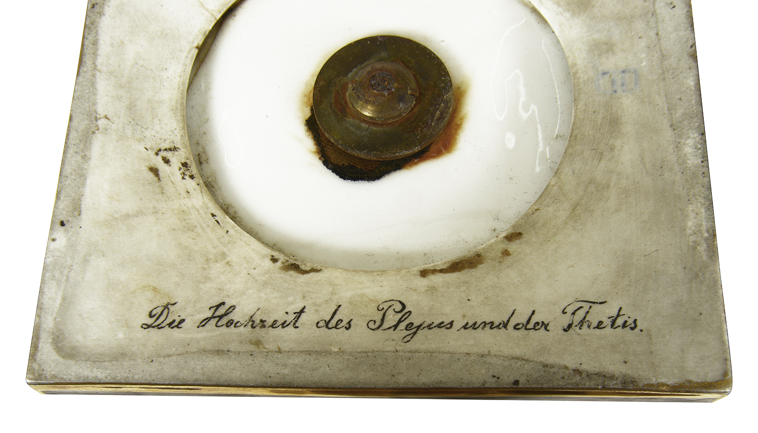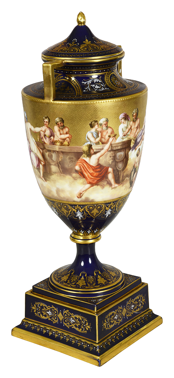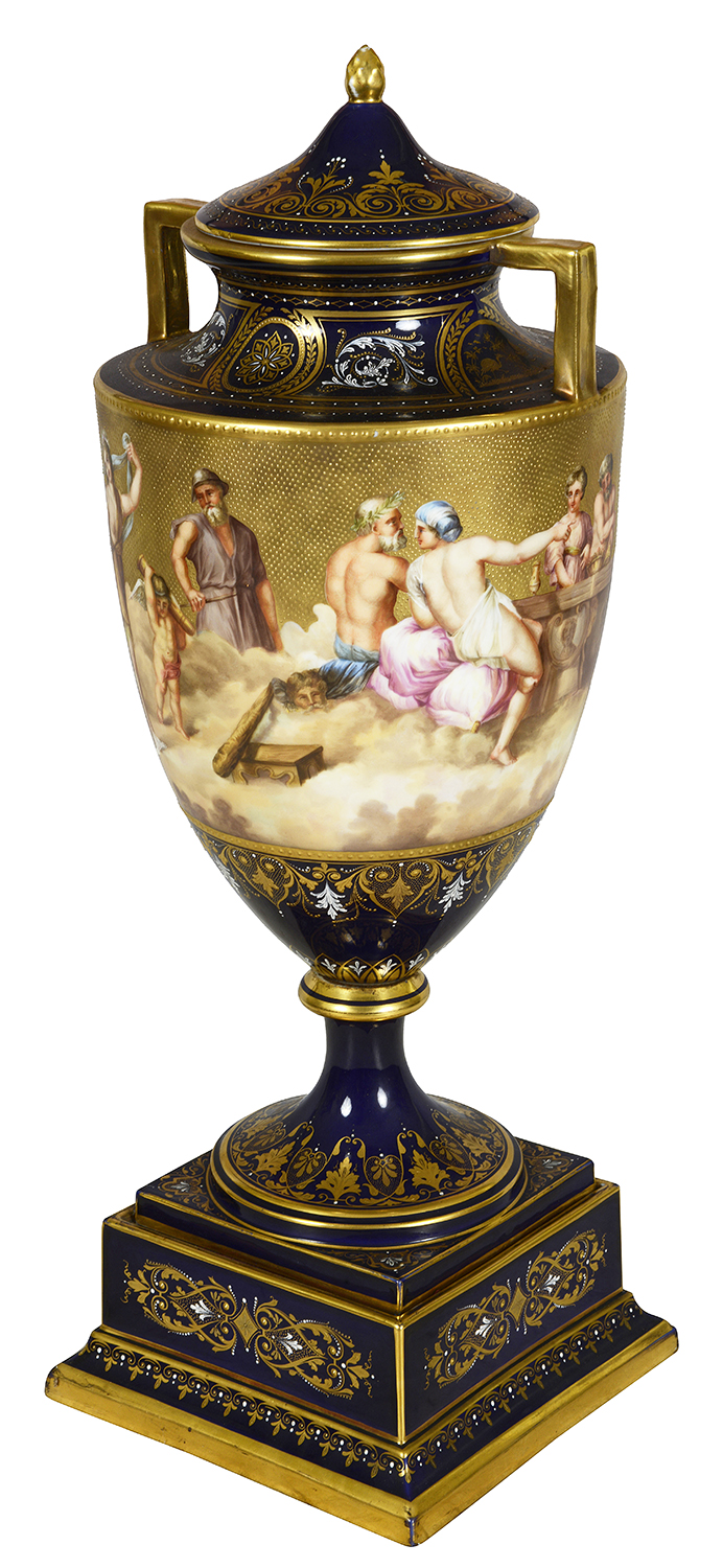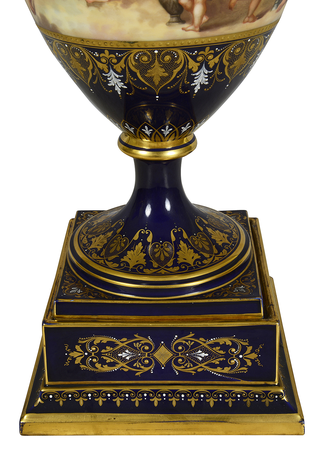 This exquisite late 19th-century Vienna porcelain lidded urn beautifully depicts “The Flourish of the Plagues of Thetis.” The urn features intricate hand-painted scenes of mythological figures, showcasing Thetis surrounded by other deities and nymphs, symbolizing both grace and turmoil. The vibrant colors, including deep blues and gold accents, enhance its elegance. The detailed artistry reflects the craftsmanship of the Vienna porcelain makers, capturing the duality of beauty and suffering inherent in the myth. With its ornate handles and a finely crafted lid, this urn serves as a stunning testament to the artistic achievements of its era.