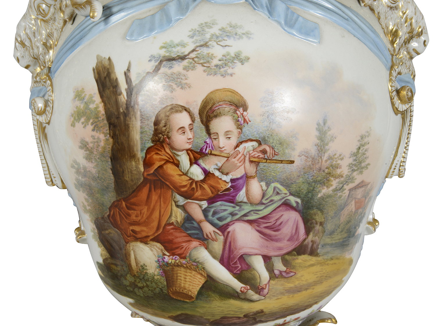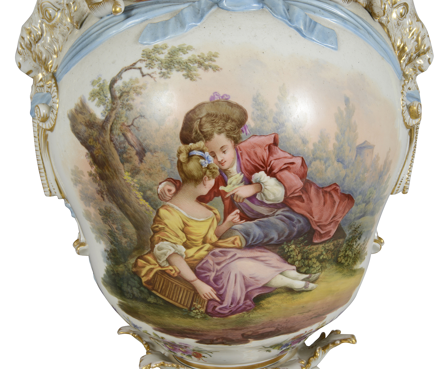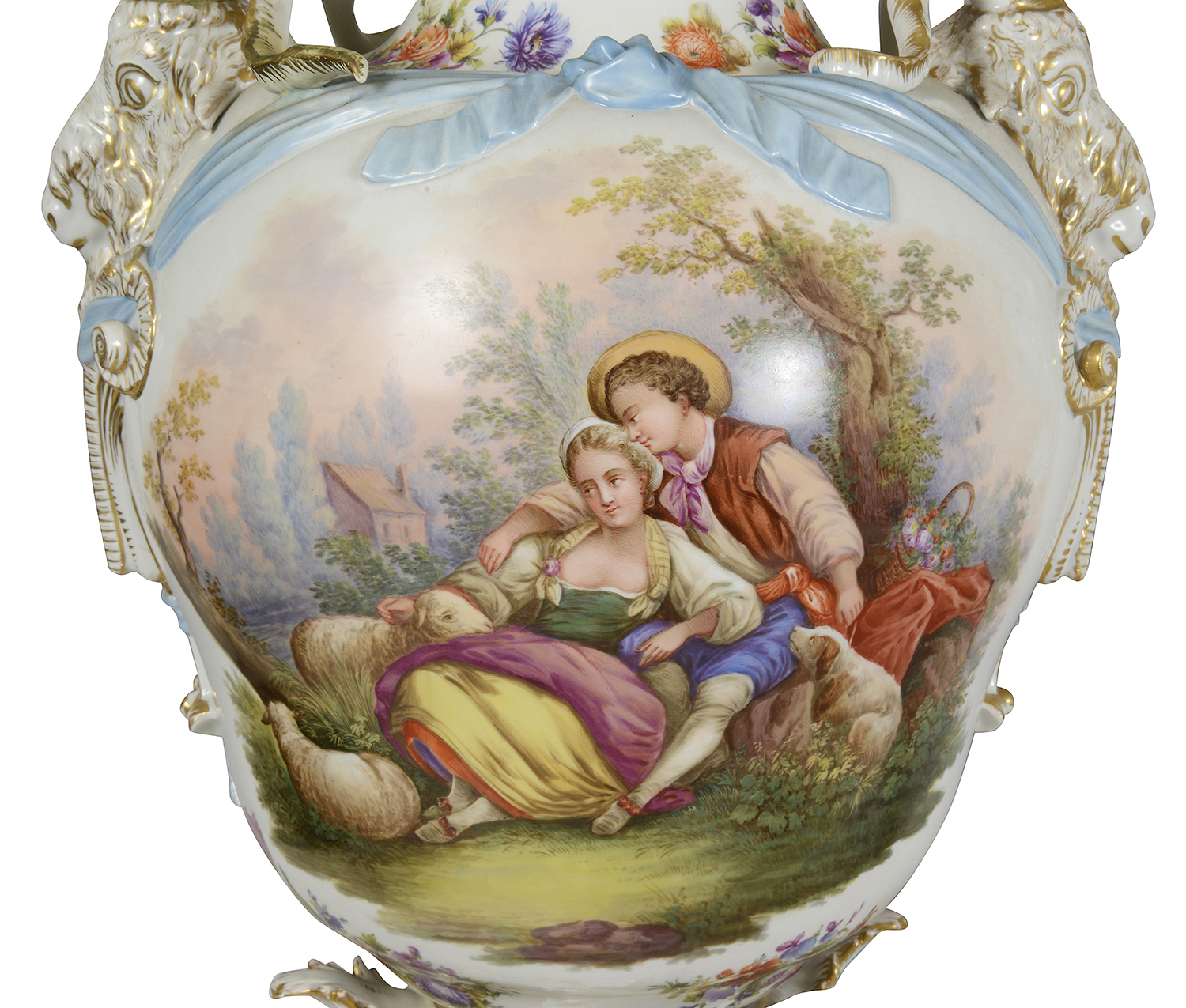 These exquisite late 19th-century pair of Berlin porcelain lidded vases showcase intricate craftsmanship and artistry. Each vase features finely painted scenes depicting pastoral life, with charming figures engaged in serene activities. The vibrant colors and delicate floral motifs enhance their elegance. Notable design elements include ornate handles in the form of Rams heads and a striking finial adorned with roses, while the bases are supported by a sturdy pedestal. These vases epitomize the luxurious style of the period, making them a captivating addition to any collection.