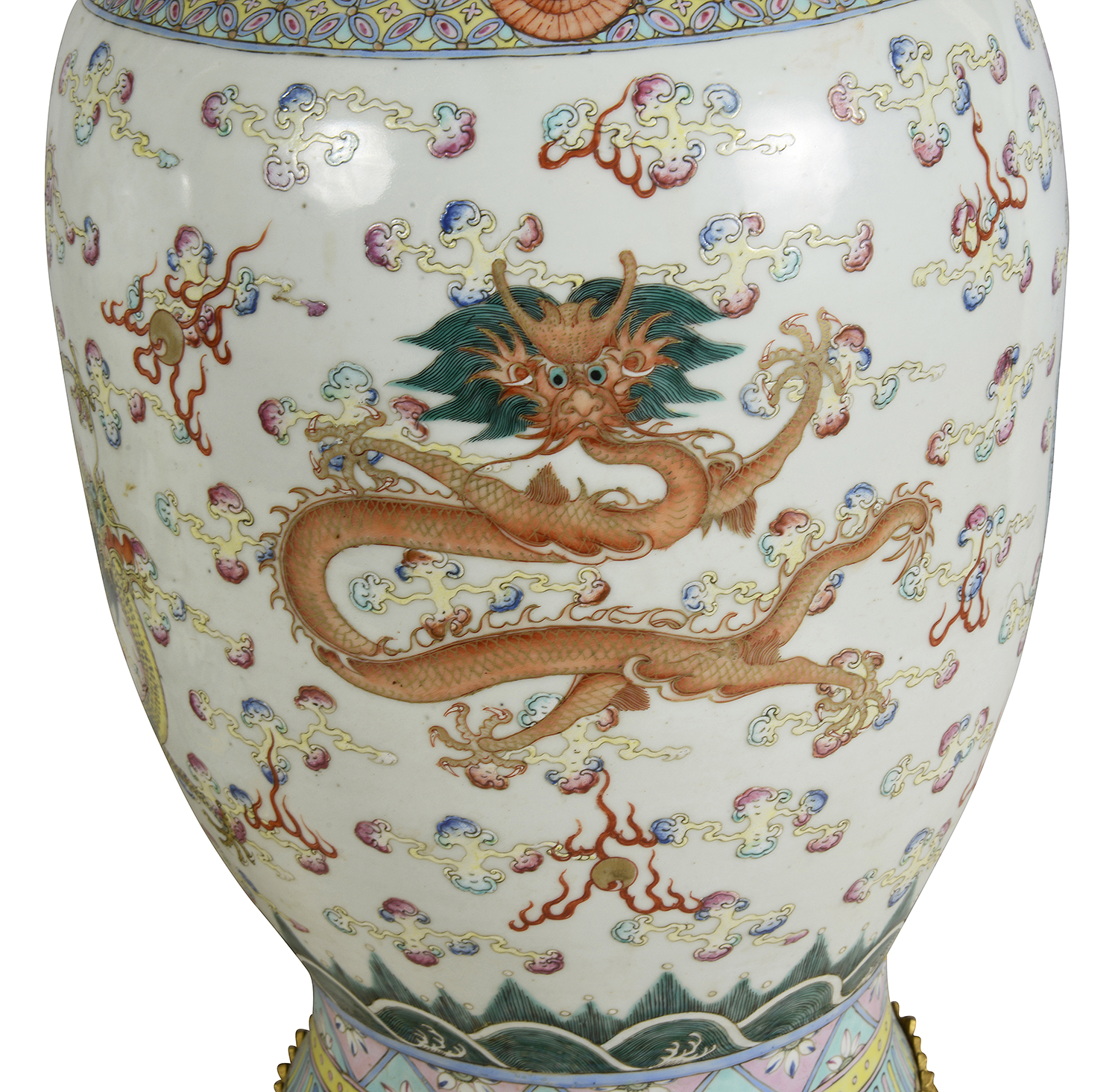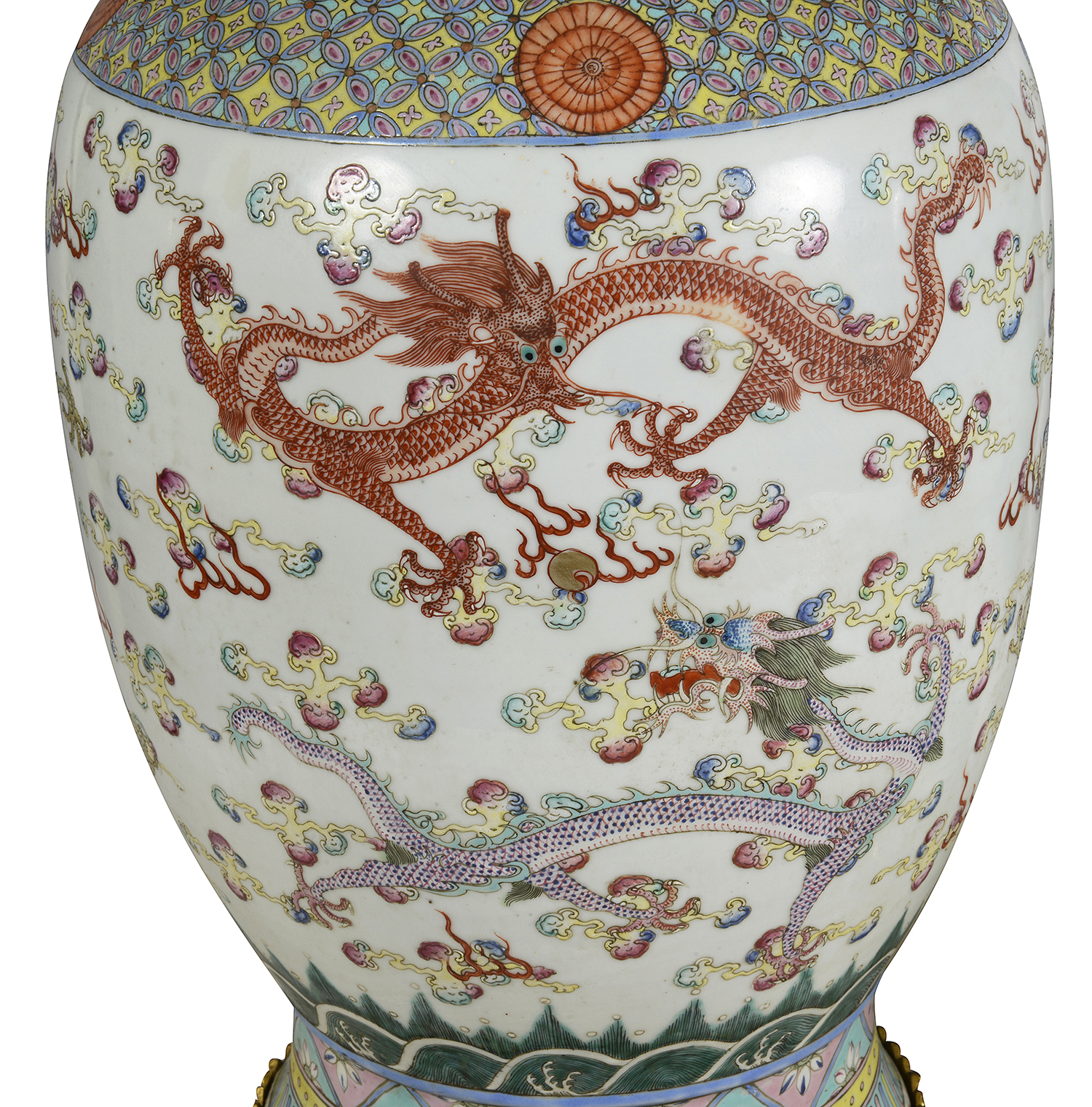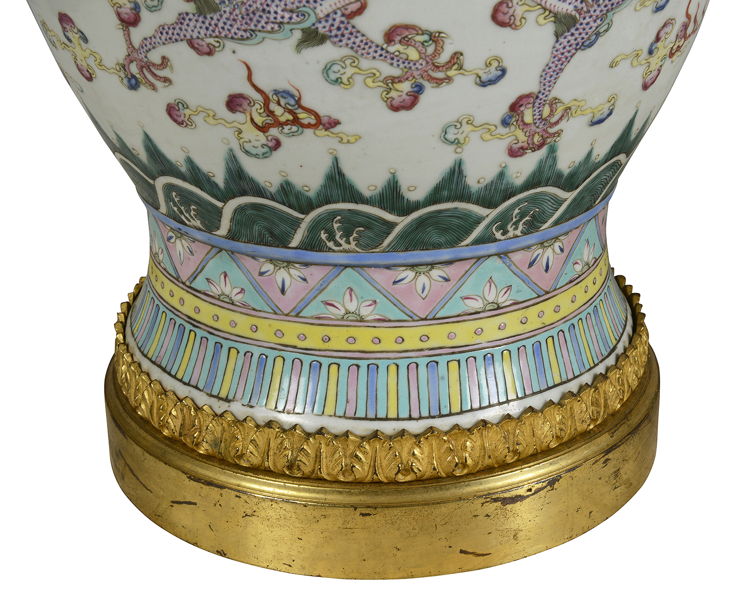 This exquisite pair of 19th-century Chinese Famille Rose porcelain vases have been elegantly transformed into lamps. Characterized by vibrant, multicolored floral motifs and intricate designs, the vases feature symbolic elements like dragons and phoenixes, representing power and prosperity. The porcelain showcases the distinctive Famille Rose palette, known for its delicate pinks and greens, accentuated by gilded bronze mounts that add a touch of sophistication. The vases’ graceful silhouette and ornate details make them not only functional but also stunning decorative pieces, reflecting the artistry of Qing Dynasty craftsmanship and the rich cultural heritage of China.