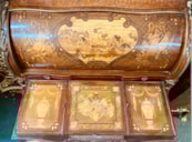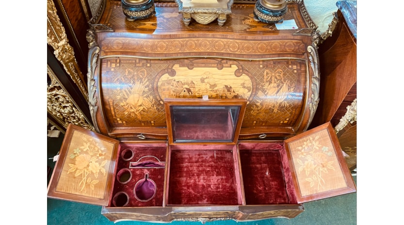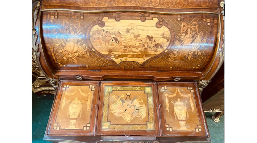 This exquisite 19th-century French marquetry bureau showcases exceptional craftsmanship and artistry. Adorned with intricate floral and landscape motifs, the bureau features a rich, polished wood veneer that enhances its elegance. The fitted interior boasts a variety of compartments, ideal for stationery and personal items, all lined with luxurious velvet. Its graceful curves and ornate bronze mounts exemplify the period’s design aesthetic, making it a stunning statement piece for any decor. This rare bureau not only serves functional purposes but also stands as a testament to the artistic heritage of French furniture making in the 1800s.