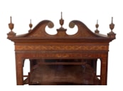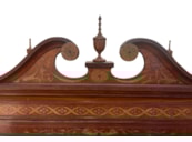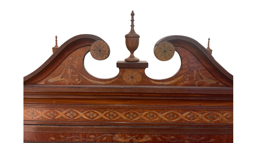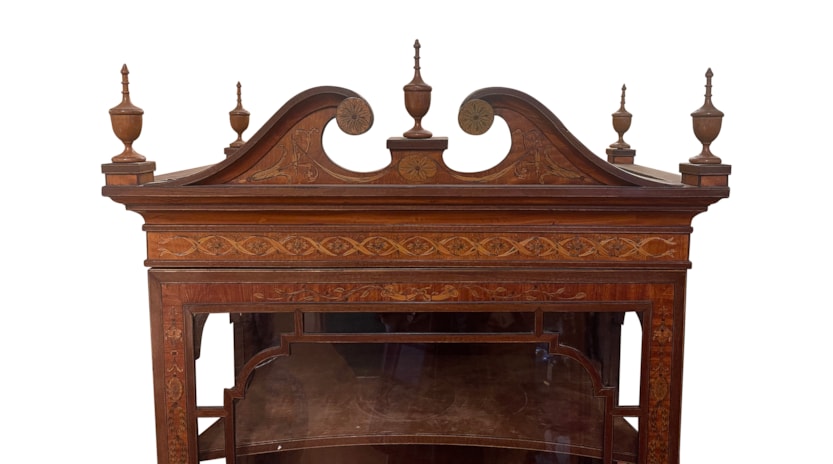 This fine quality Edwardian period display cabinet showcases the elegance of the Sheraton style, crafted from rich mahogany and adorned with intricate boxwood inlays. The cabinet features a beautifully swan neck pediment with decorative finials, adding a touch of grandeur. Its glass door opens to reveal shelves within, perfect for displaying cherished items, while the lower section exhibits delicate floral inlays that enhance its aesthetic appeal. The refined curves and tapered legs exemplify the grace characteristic of the Sheraton design. This cabinet not only serves as a functional piece of furniture but also as a stunning decorative element, reflecting the craftsmanship and sophistication of the Edwardian era.