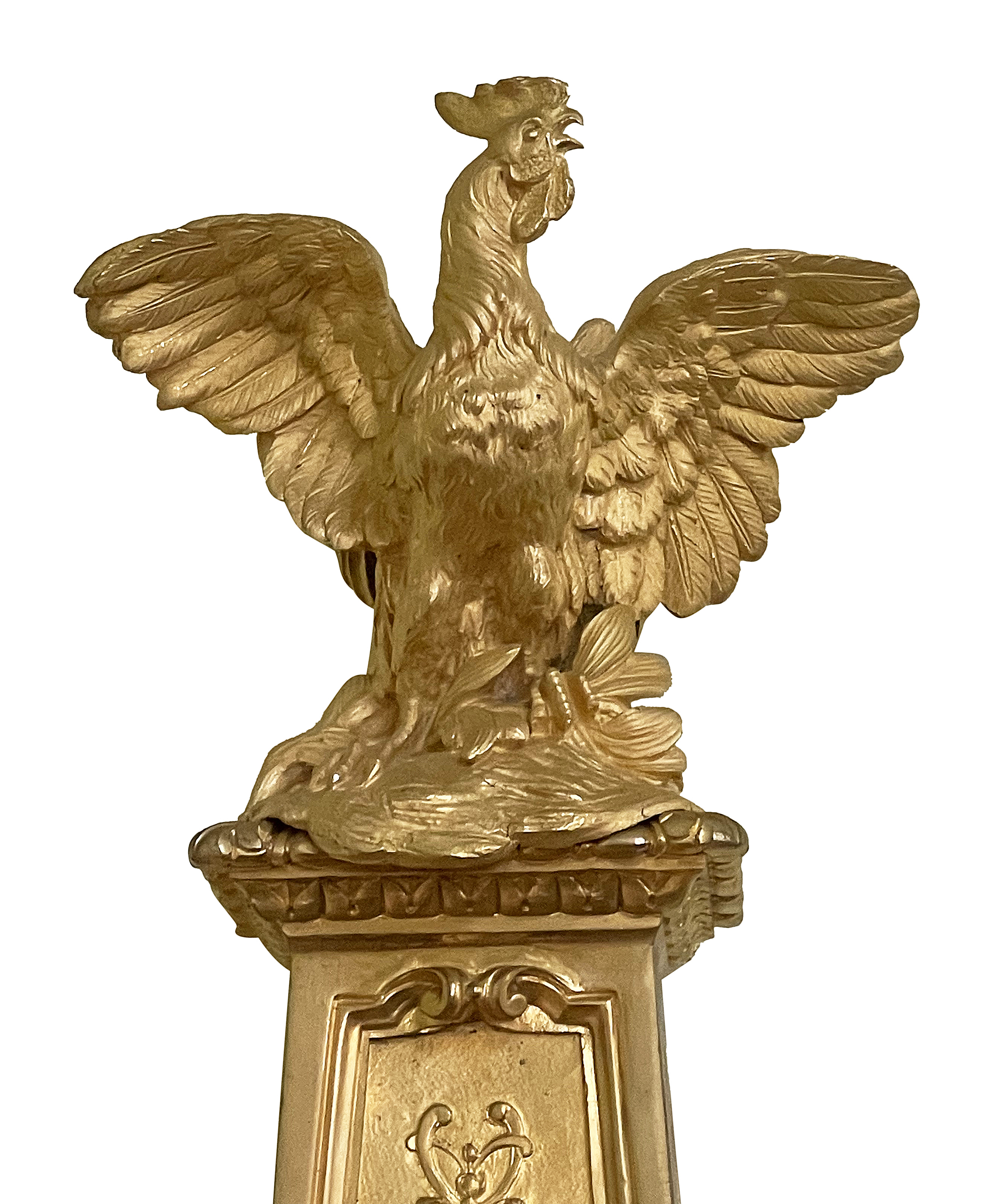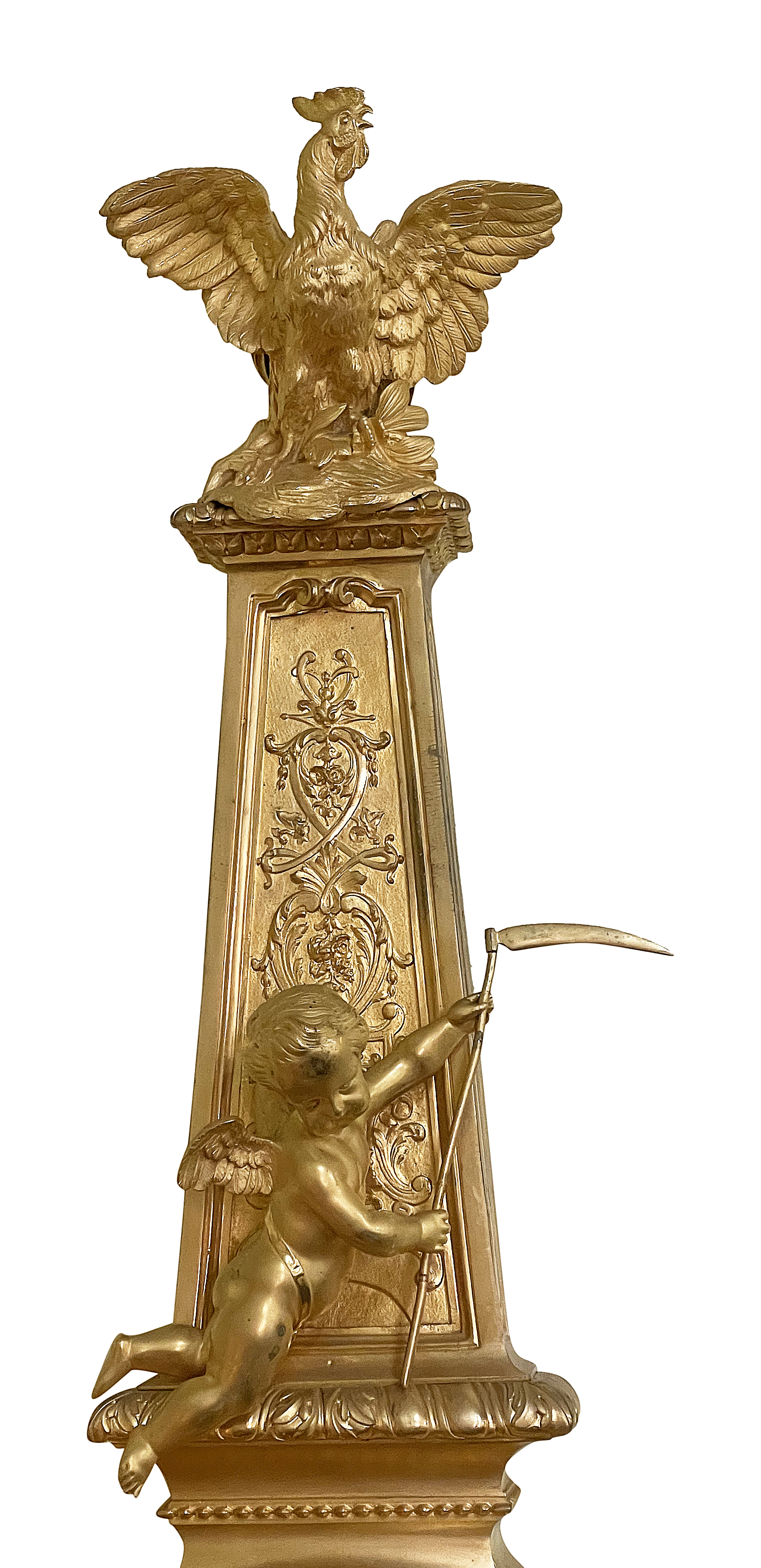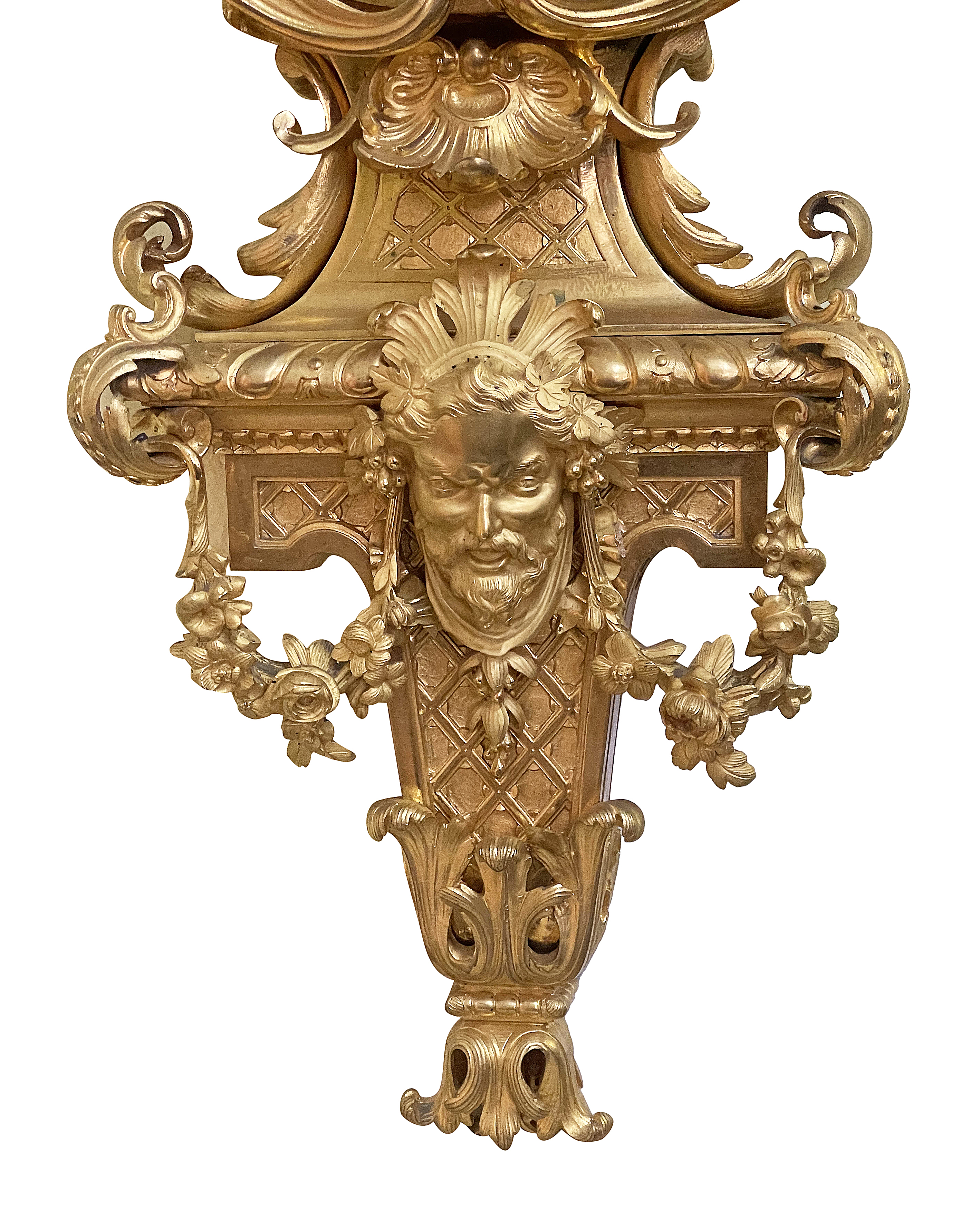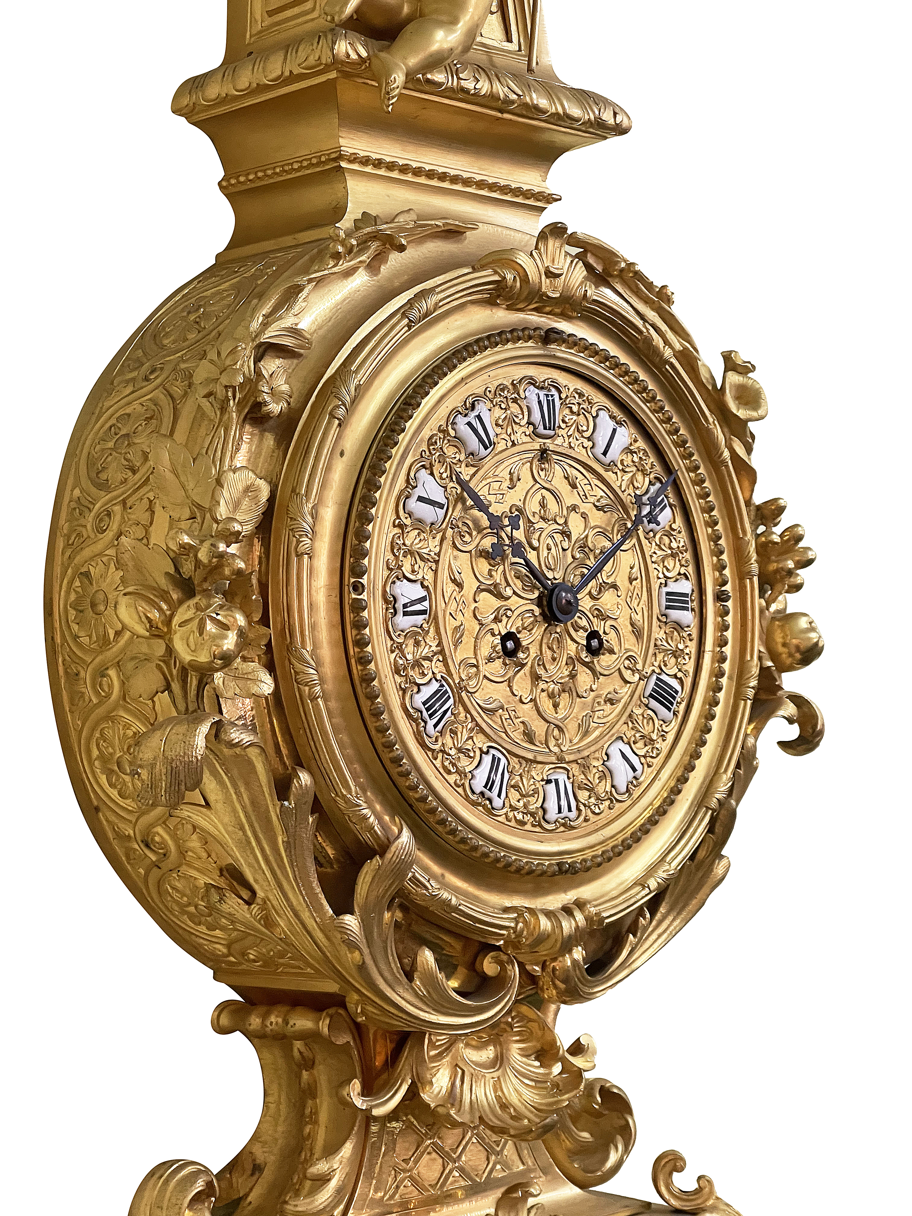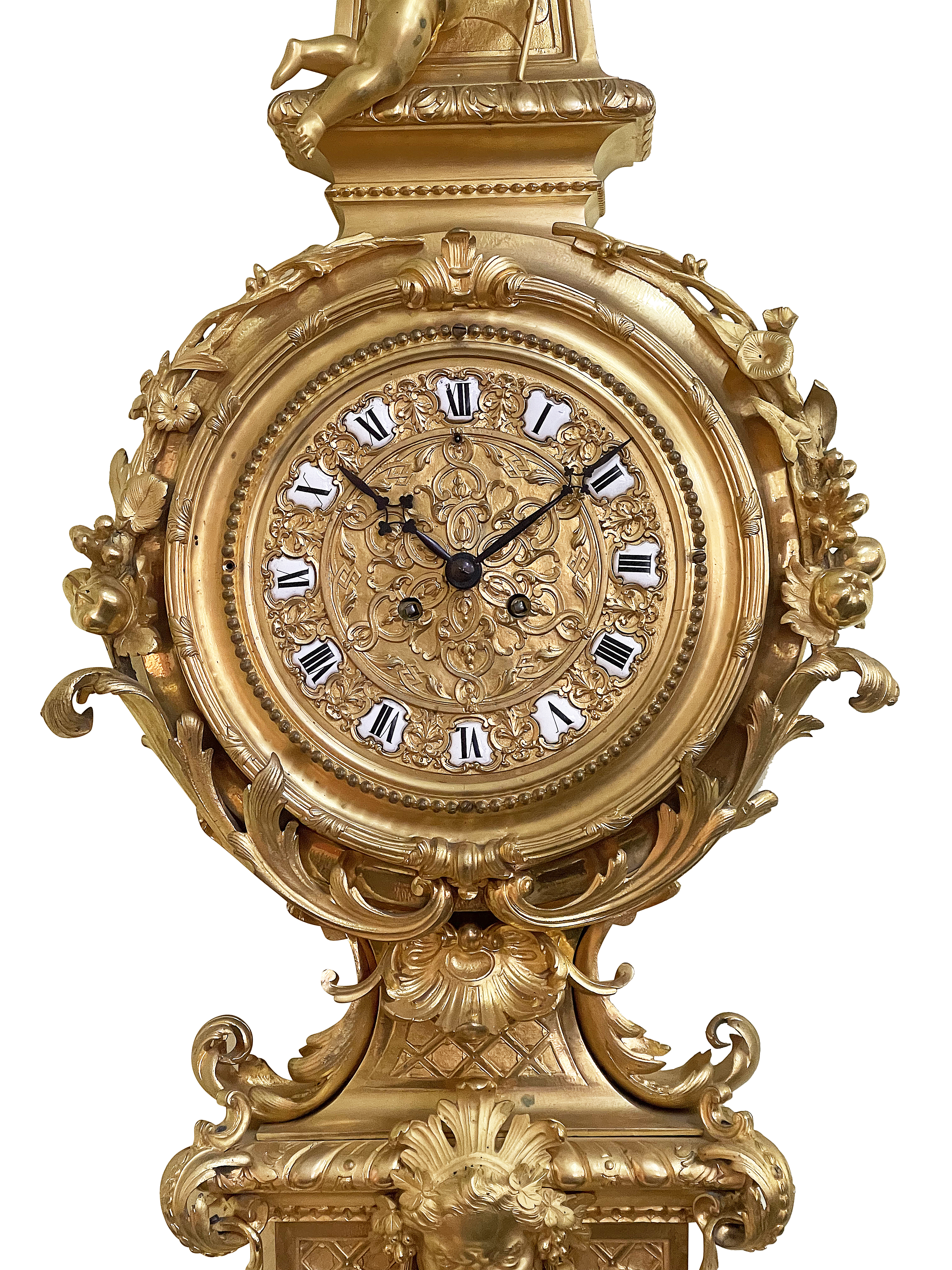 This large and impressive  late 19th-century French gilded ormolu cartel wall clock exemplifies the elegance of the Louis XVI style. Adorned with intricate detailing, it features a majestic eagle perched atop an ornate pediment, symbolizing power and nobility. The clock face, embellished with delicate floral motifs and Roman numerals, is framed by a richly decorated circular casing. Below, cherubic figures enhance its charm, showcasing craftsmanship and artistry. The overall design harmonizes classical elements with opulence, making it a stunning decorative piece that reflects the grandeur of its era. A true statement of sophistication for any refined interior.