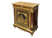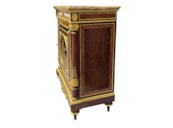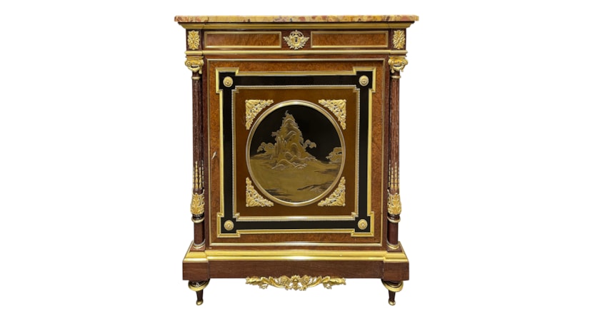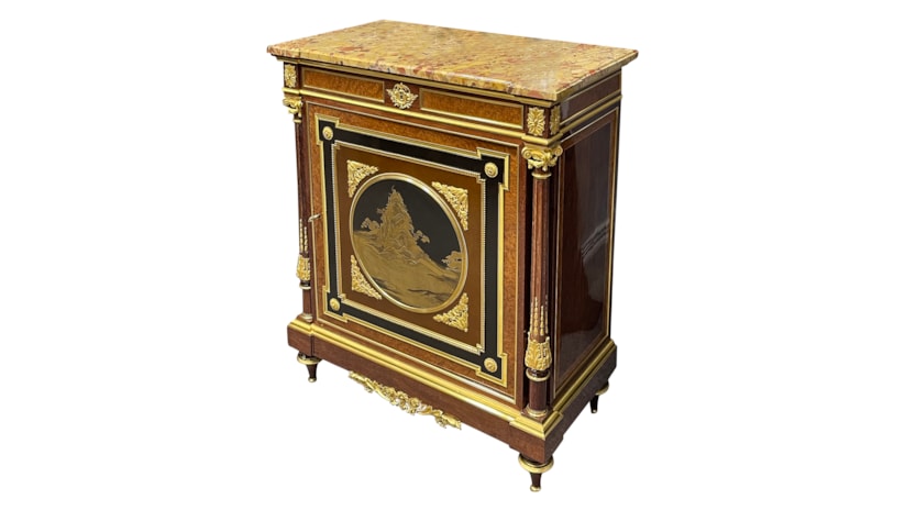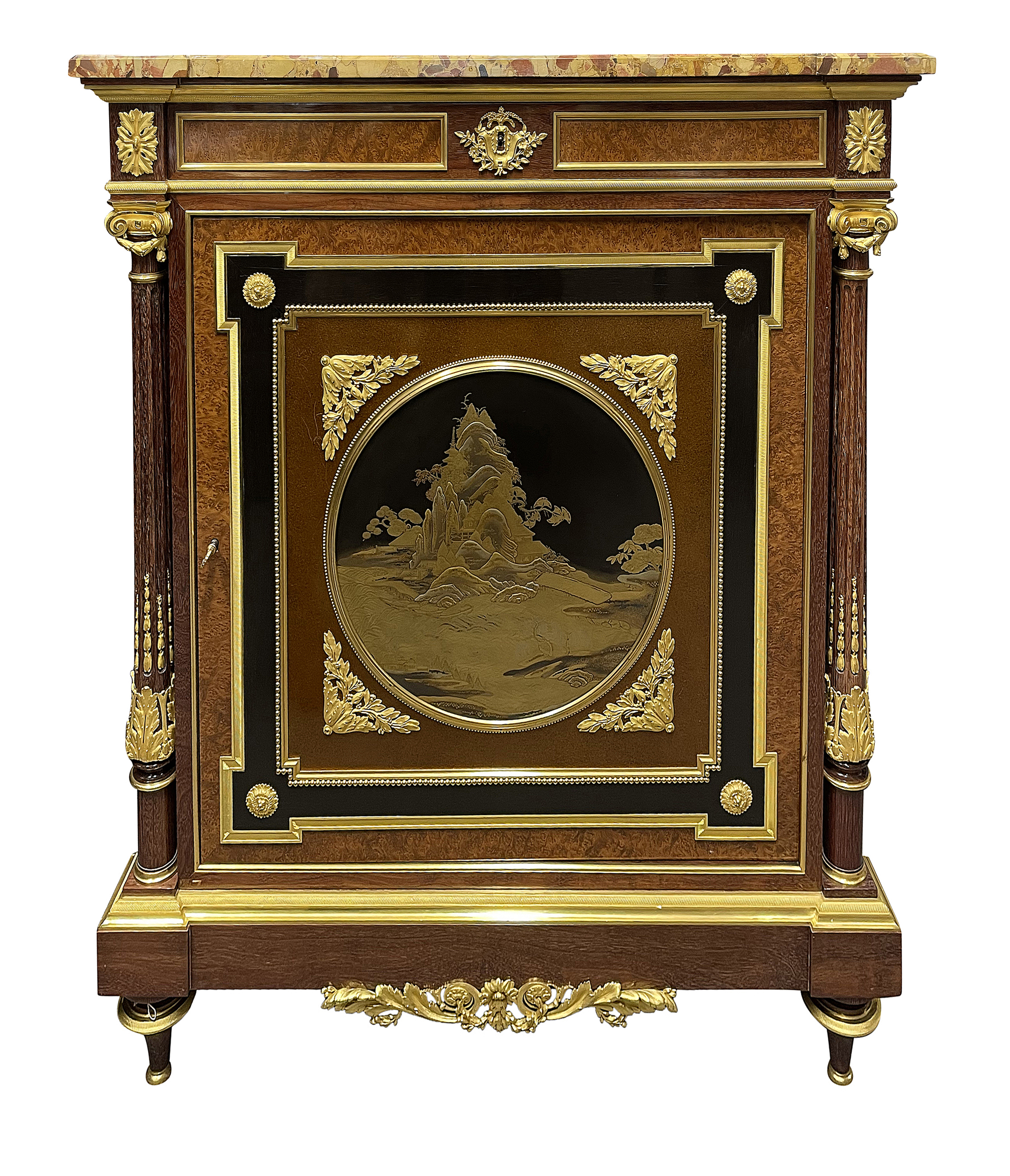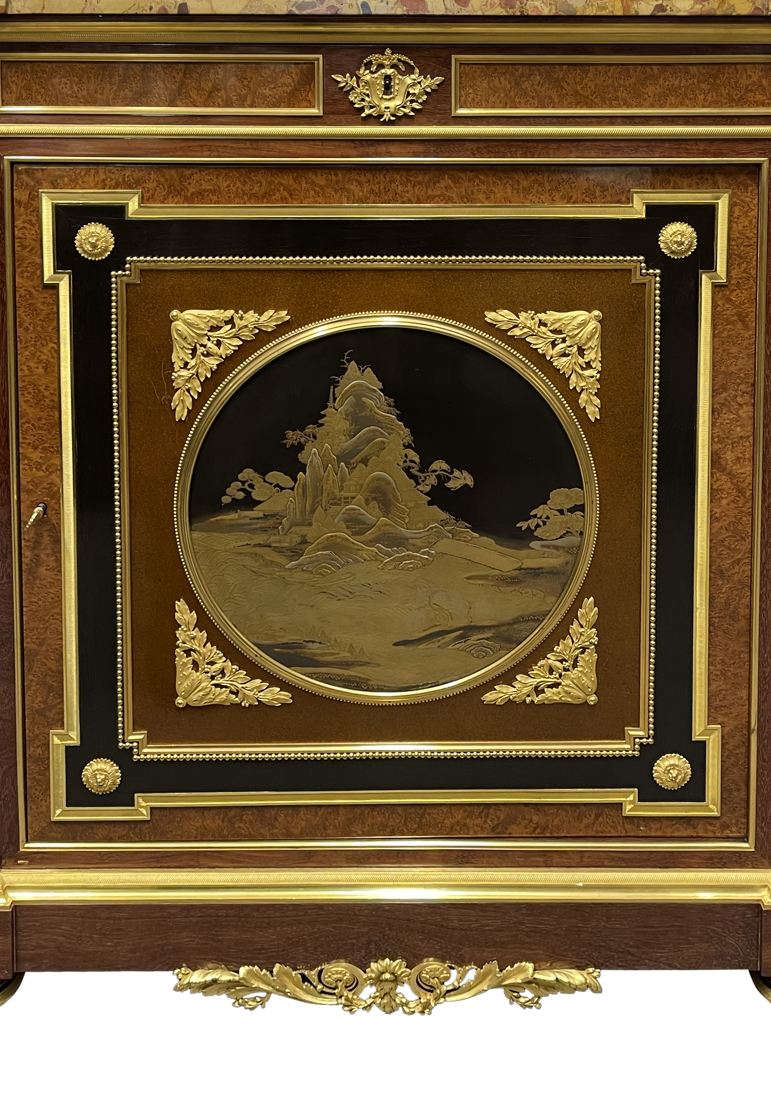 This exquisite late 19th-century French side cabinet showcases a stunning marble top and elegant amboyna veneers. in the manner of Louis- Auguste-Alfred Beudeley, it features intricate gilded ormolu mounts that enhance its luxurious appeal. The cabinet includes a single frieze drawer for storage and a striking central panel adorned with Japanese-style lacquer, depicting serene landscapes. Its design harmoniously blends traditional European craftsmanship with Asian influences, making it a captivating piece of furniture history. The attention to detail and quality materials reflect the opulence of the period, making this cabinet a remarkable addition to any collection.