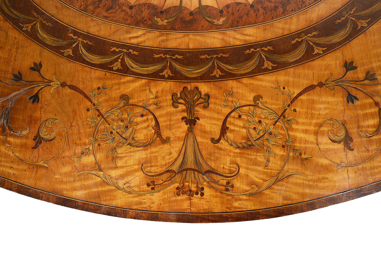 A fine quality late 19th century Sheraton revival Satinwood inlaid Pembroke table. Having this wonderful marquetry inlay of classical ribbon swags. and scrolling foliate decoration. A single frieze bowed drawer, raised on square tapering legs, terminating in spade feet. Circa 1880 attributed to Edwards and Roberts.