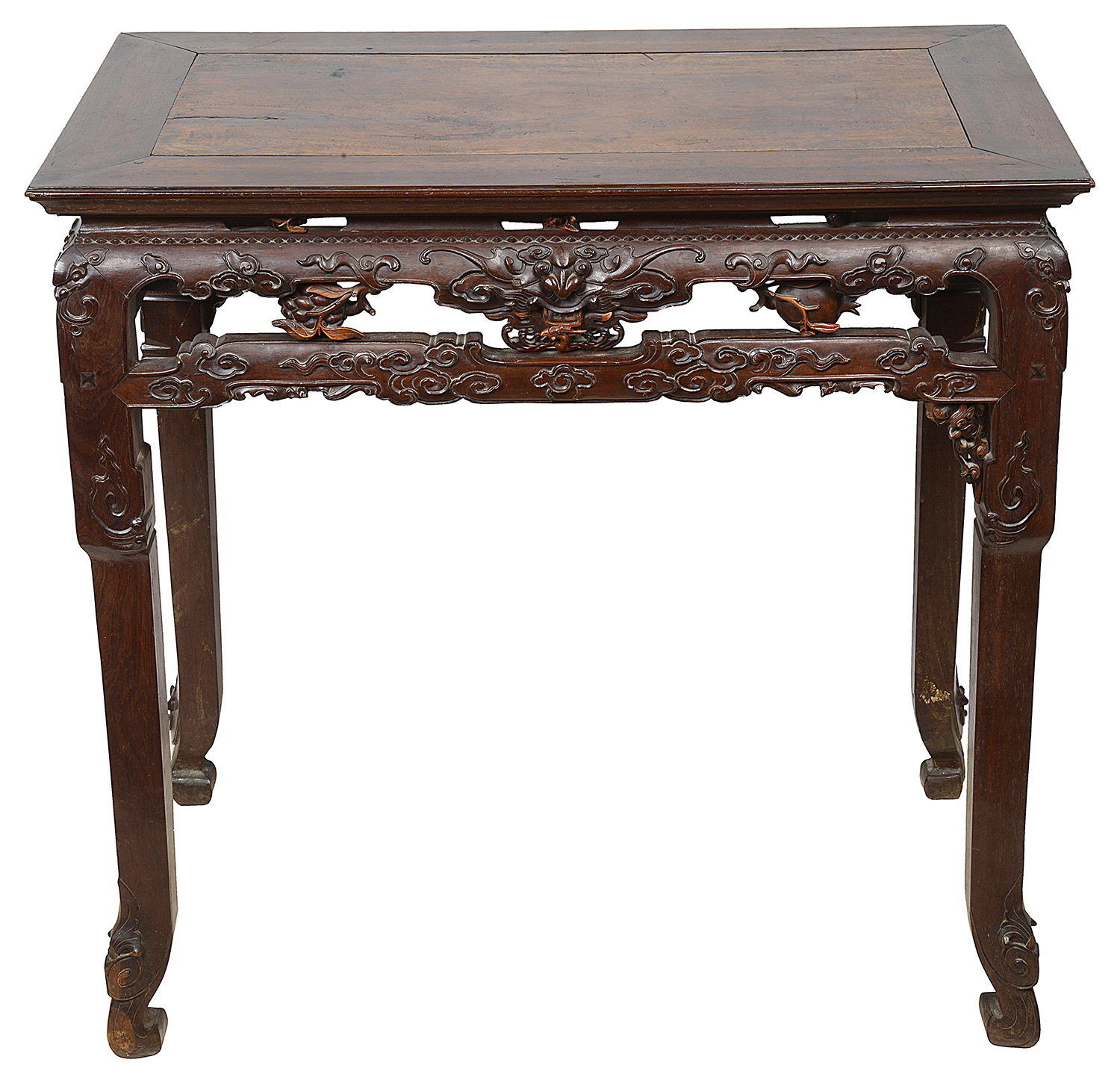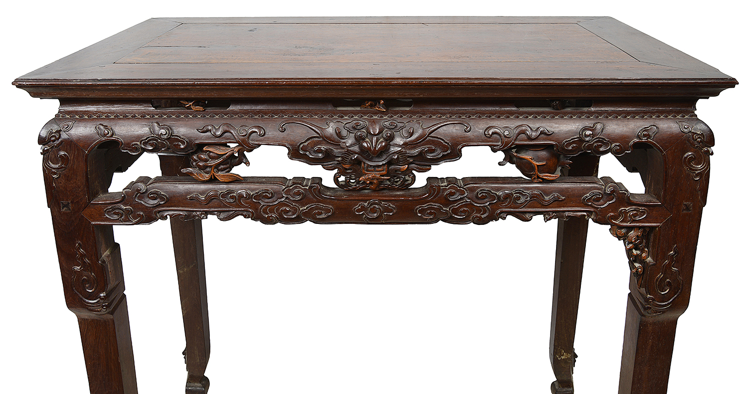 A fine quality early 19th Century Chinese hardwood side table, having wonderful hand carved intricate pierced decoration, depicting foliage, fruit and mythical Bats. An inset panel to the top and raised on cabriole like legs terminating in scrolling feet.