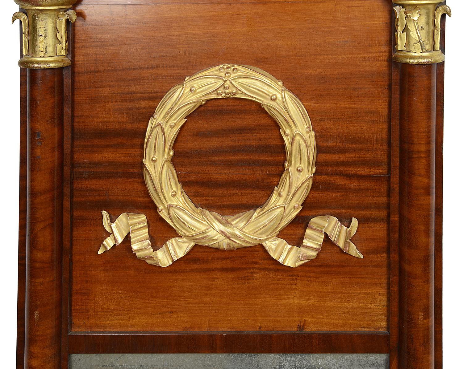 A very stylish C19th French Empire style Mahogany wall mirror, having wonderful classical carved gilt wood wreath and ribbon decoration. Gadroon moulding and columns either side and the original Mercury mirror plate.