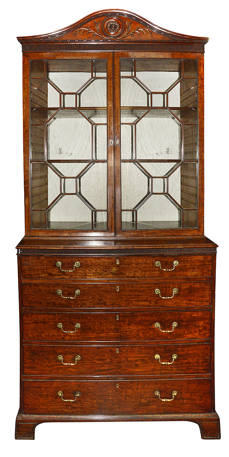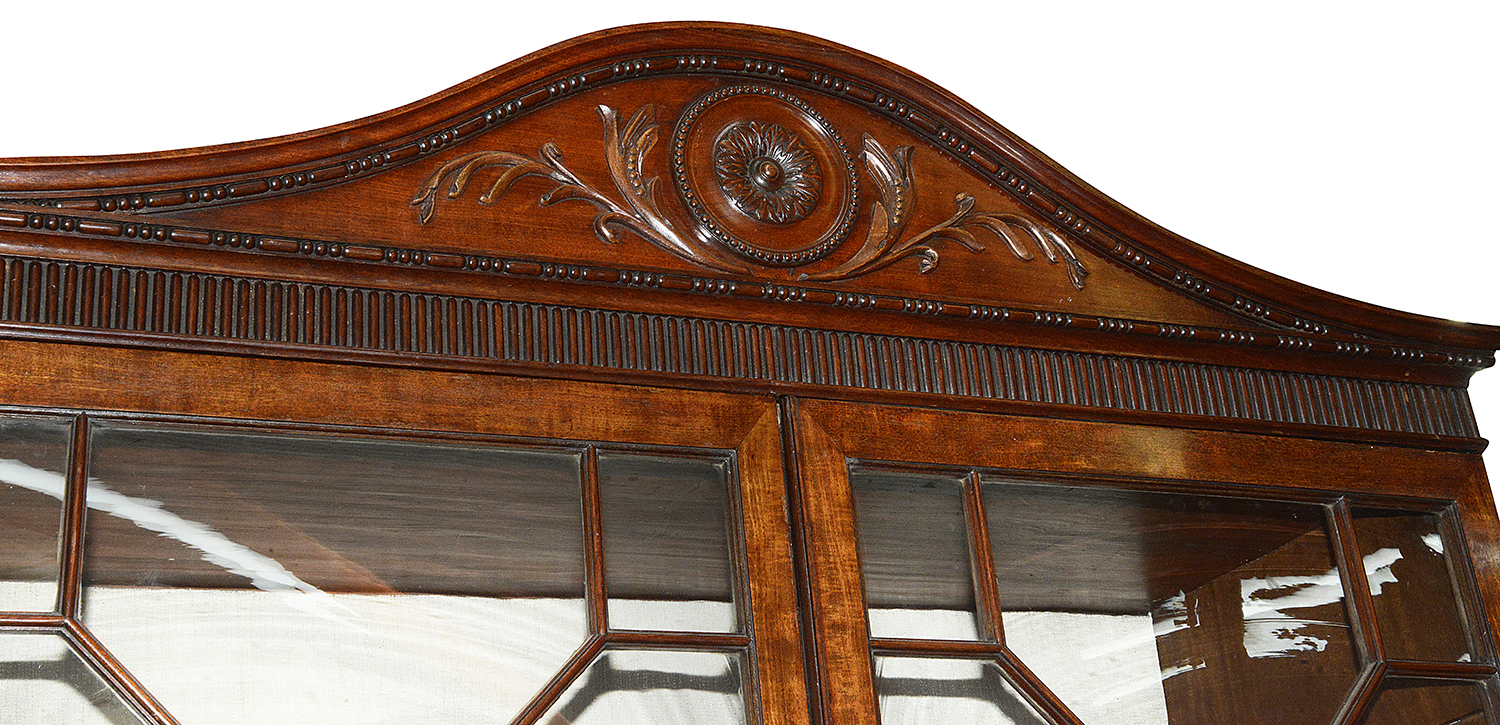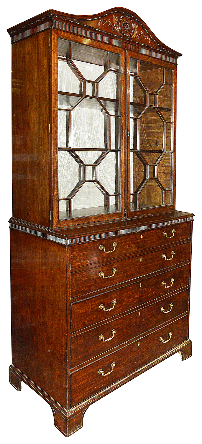 A fine quality late 18th Century, Georgian period Mahogany Secretaire bookcase. Having a wonderfully hand carved arched cornice with beaded, leaf and motif decoration. The astral glazed bookcase doors, with adjustable shelves within.