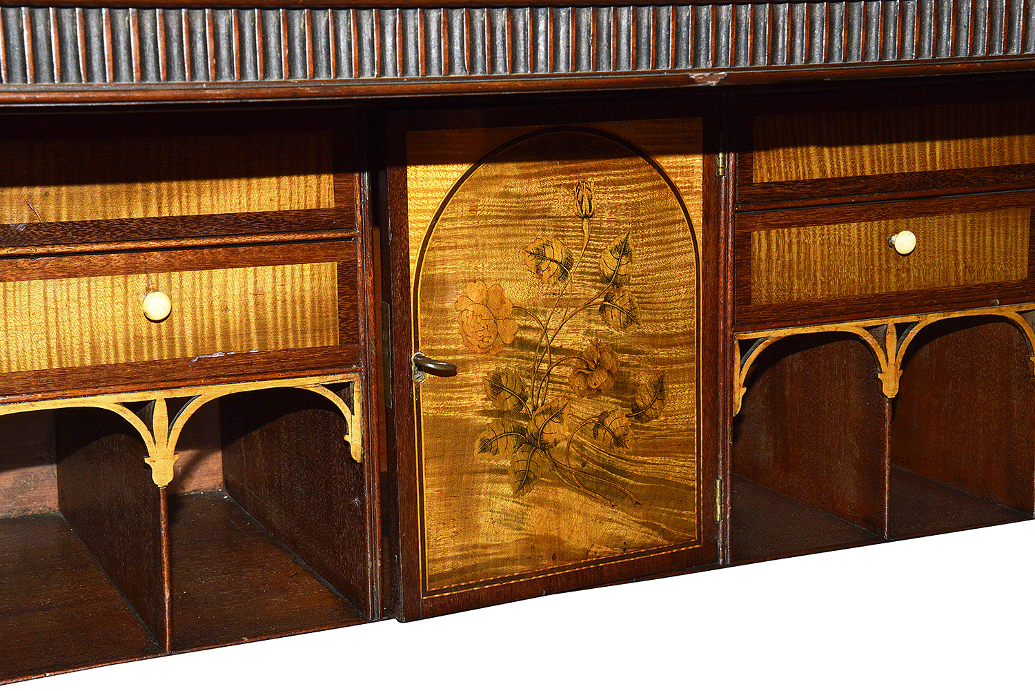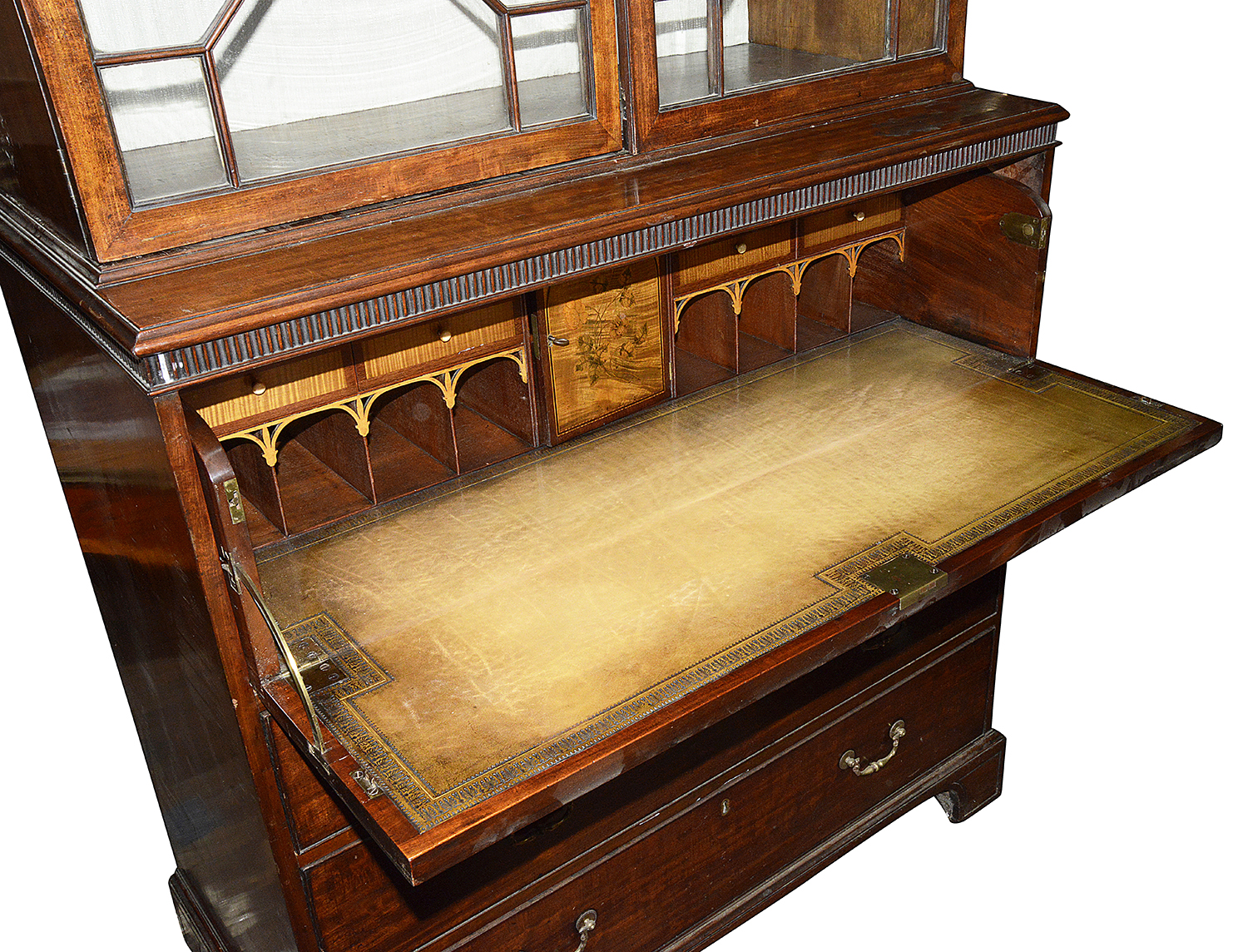 The hinged top two dummy drawers hinge open to reveal the beautiful fitted secretaire interior, with Satinwood and Boxwood inlay to the pigeon holes and drawers. The hide covered writing surface with tooled edging.