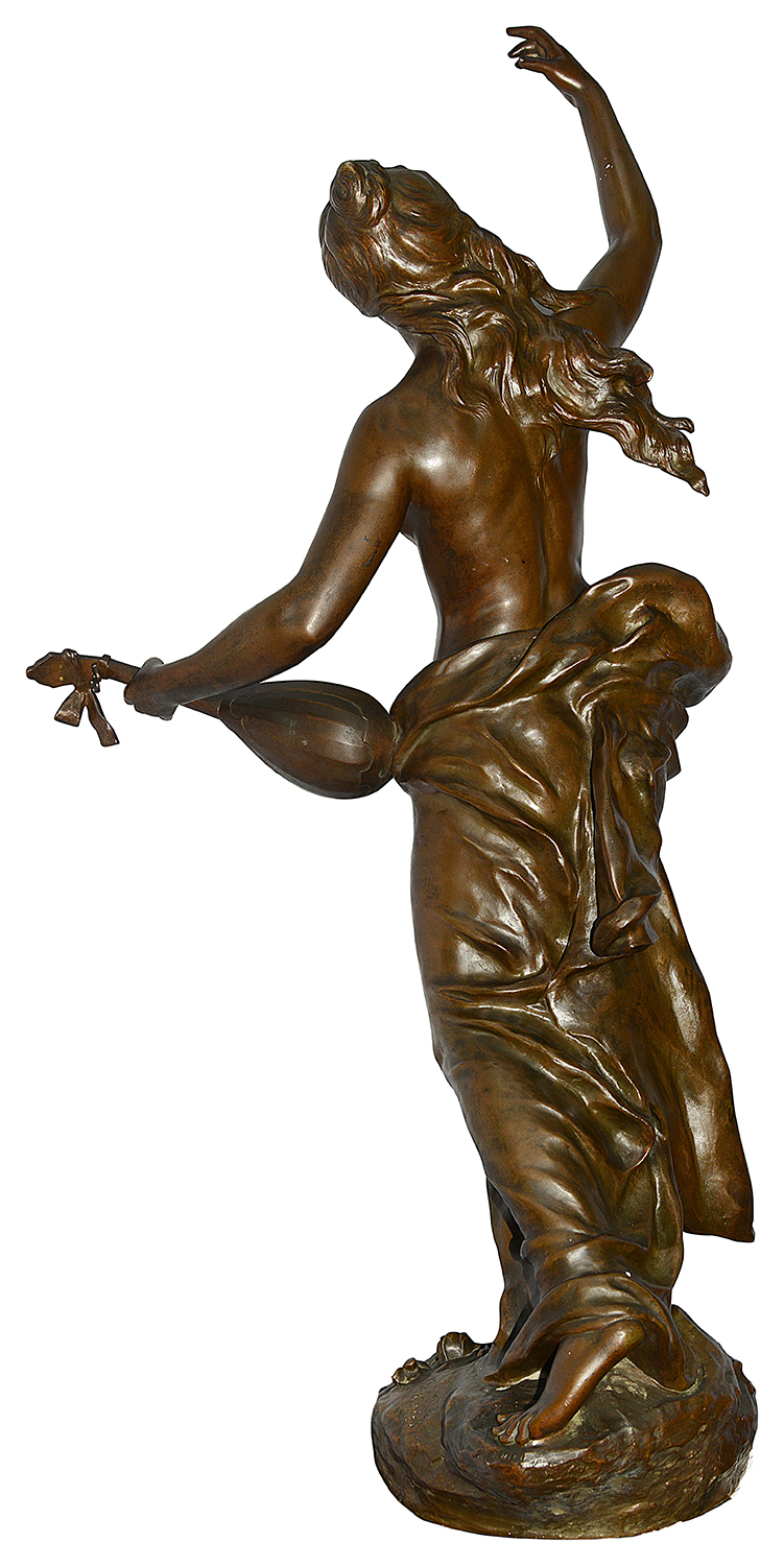 This classical bronze statue depicts a semi-nude maiden, elegantly posed with one arm raised, embodying grace and vitality. Her flowing drapery, accentuated by intricate detailing, hints at movement and fluidity. The figure exudes a sense of joyous freedom, holding an object that suggests musicality or celebration. The artist, S. Kinsburger, skillfully captures the essence of femininity and beauty, enhancing the sculpture with a rich patina that adds warmth and depth. The statue’s base features a medallion, indicating its prestigious recognition, making it a notable piece in the realm of classical art.