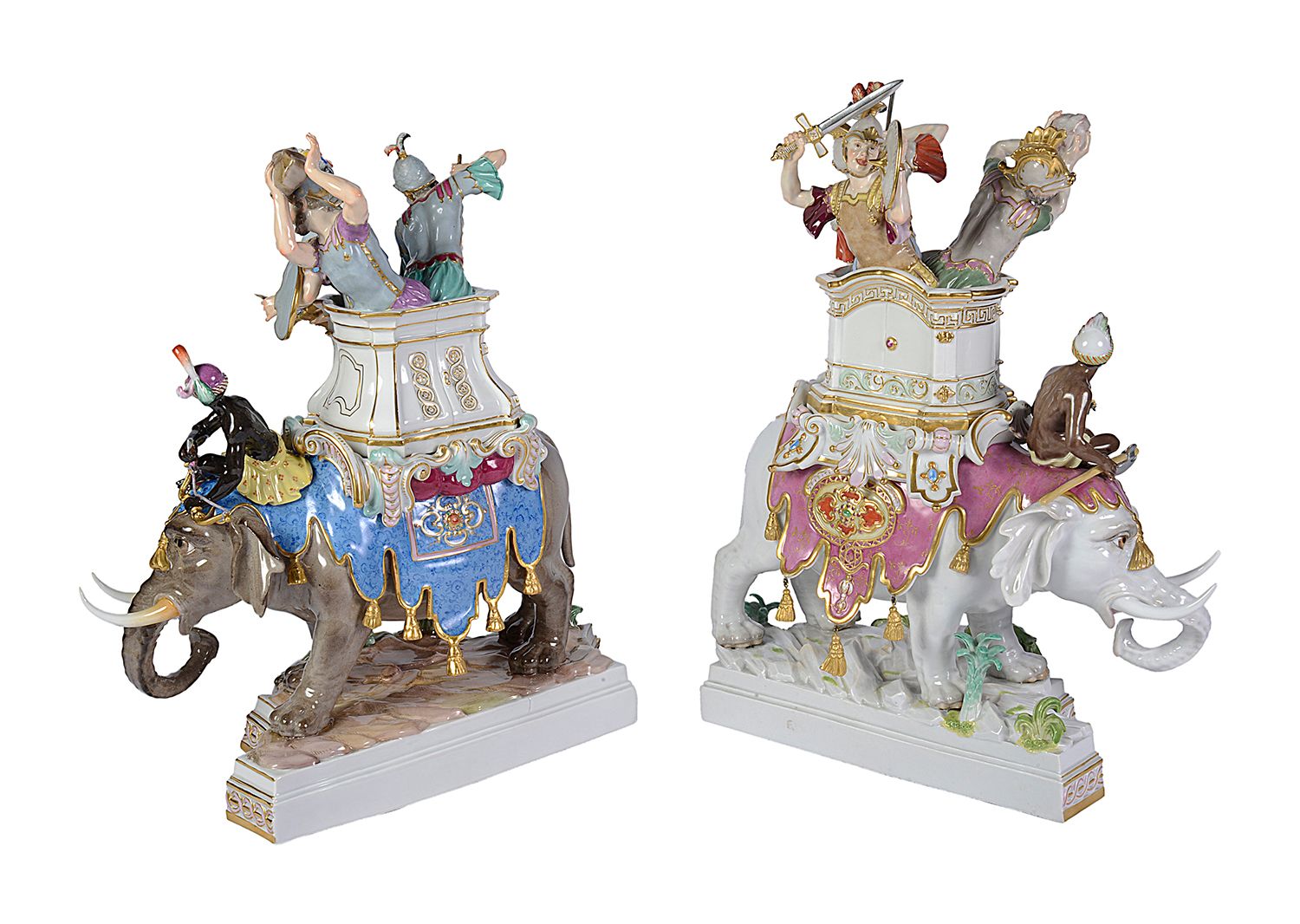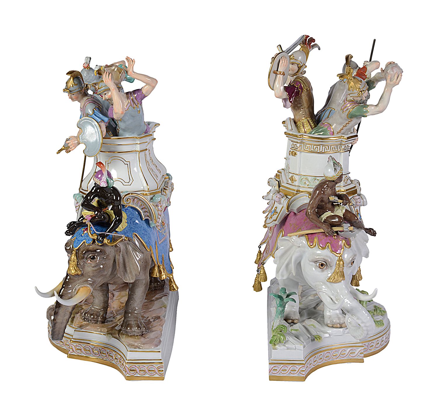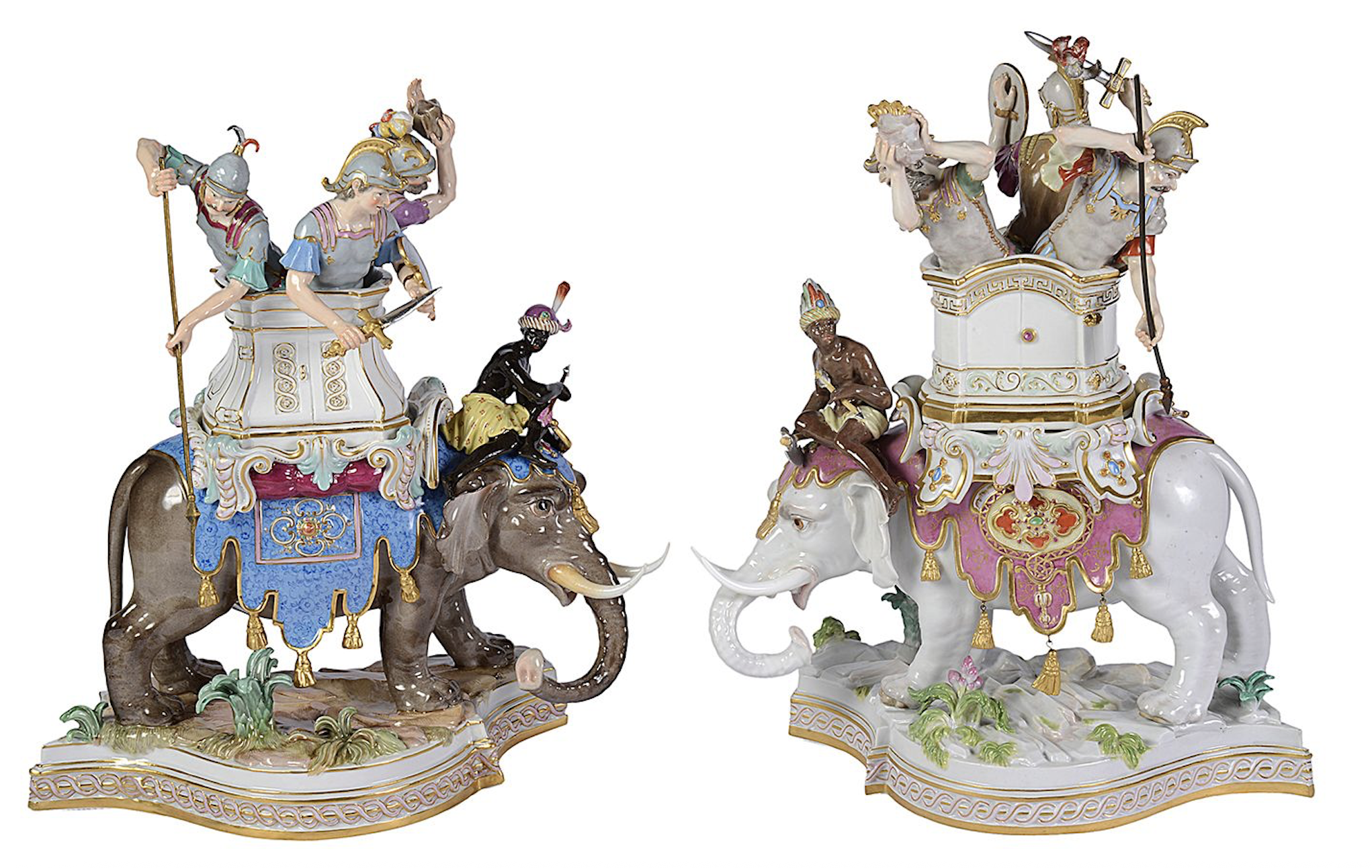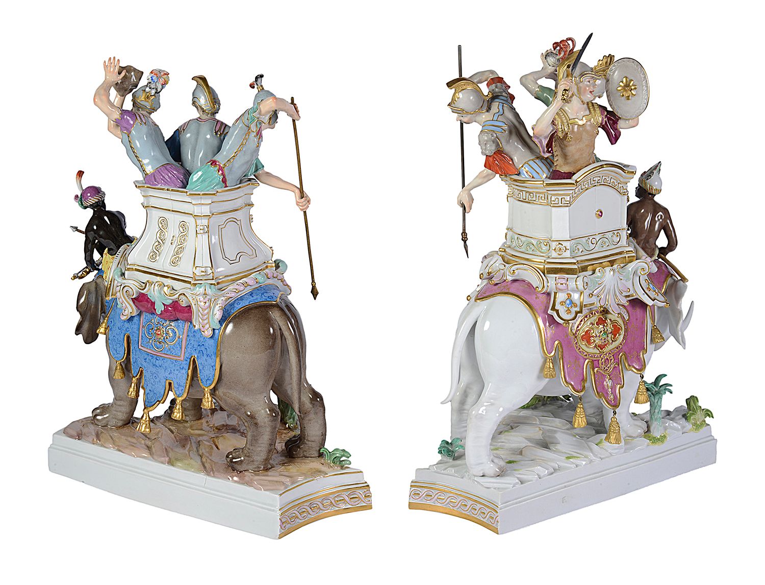 Rare pair of Meissen porcelain Elephants, depicting Alexander the Great concurring India, C19th