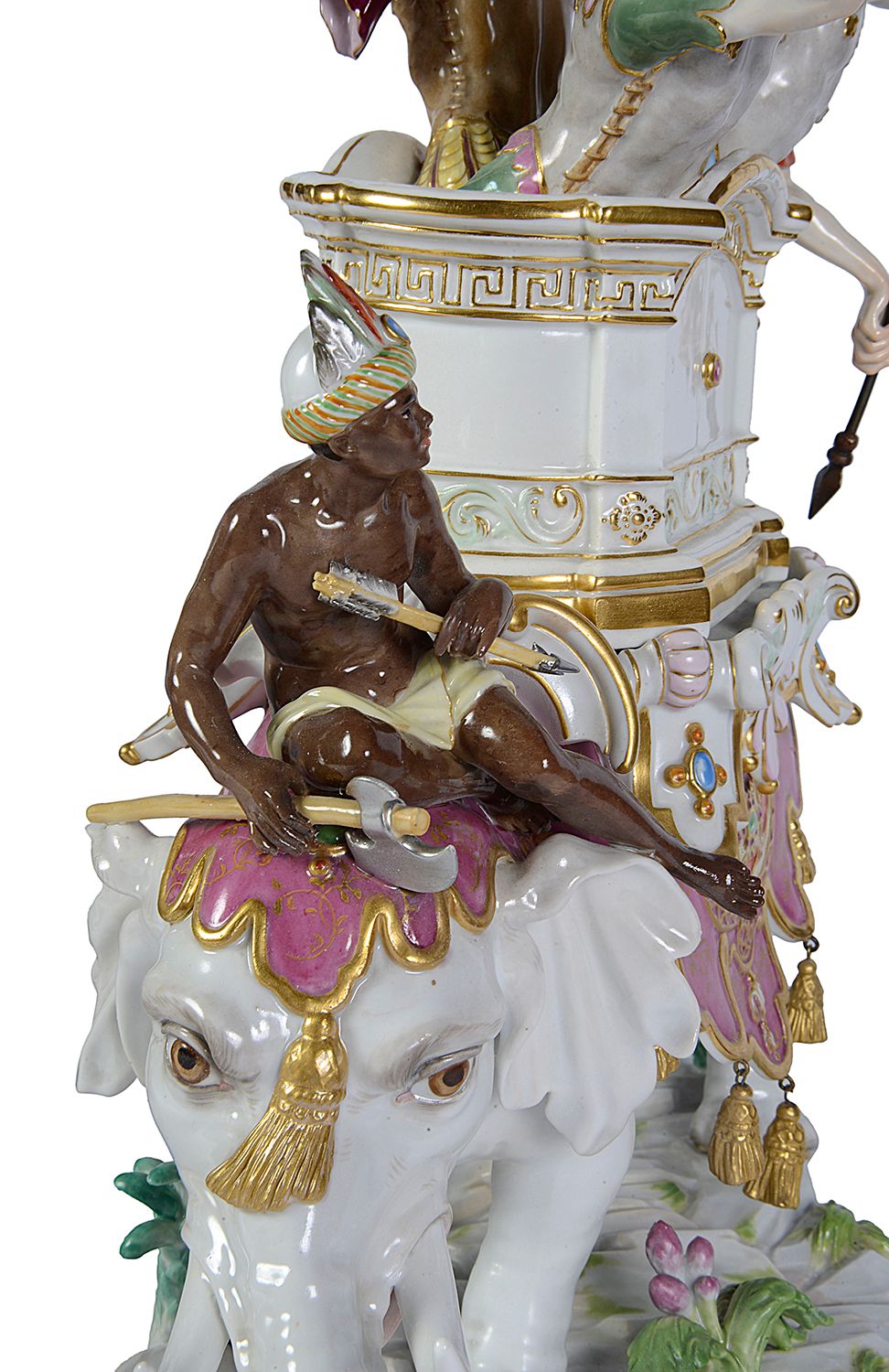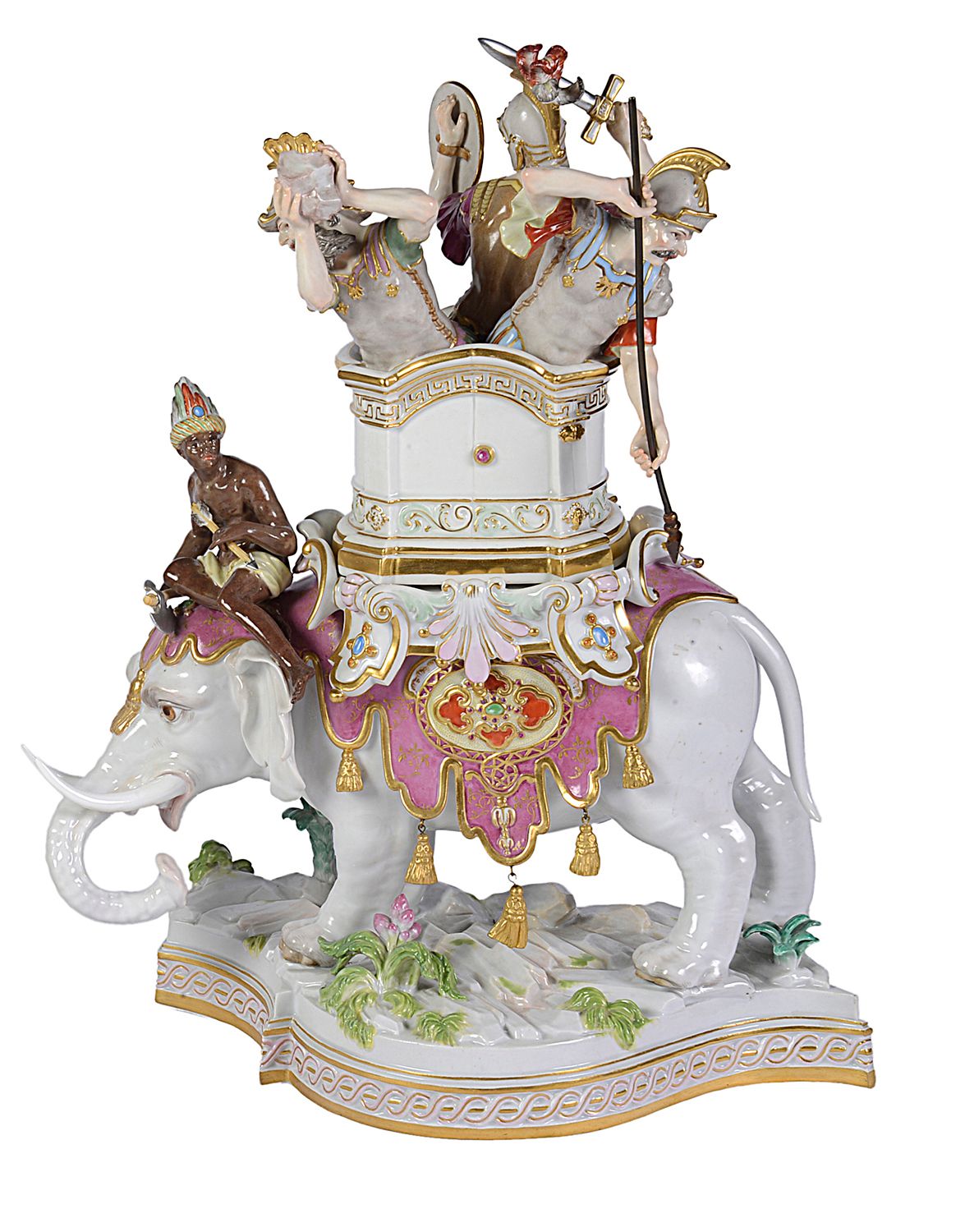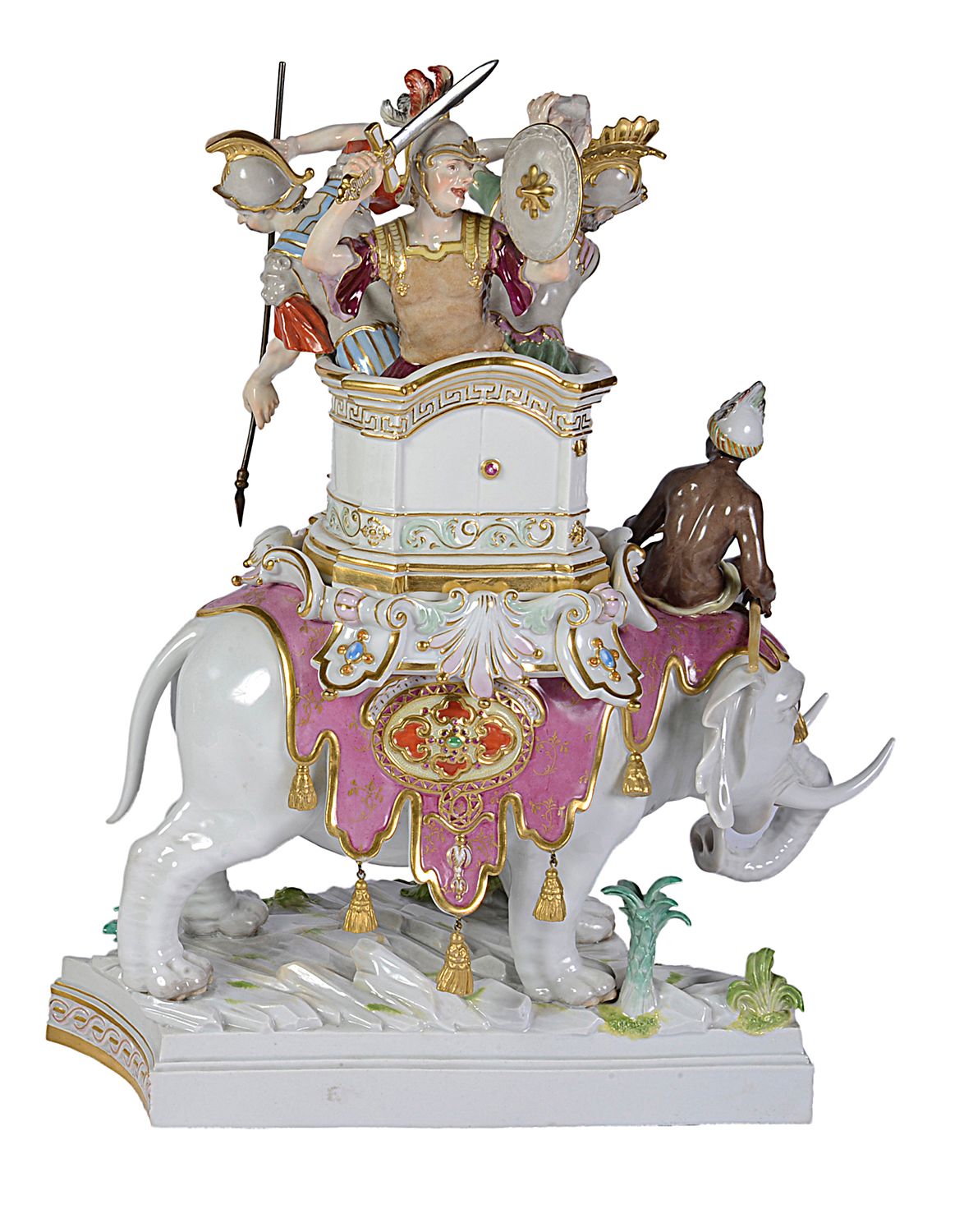 Rare pair of Meissen porcelain Elephants, depicting Alexander the Great concurring India, C19th