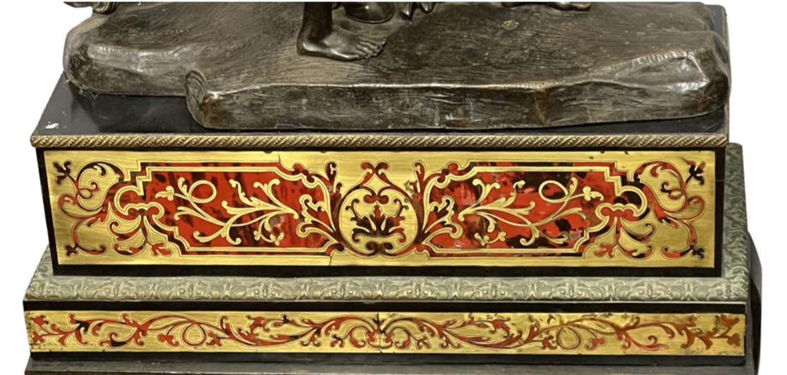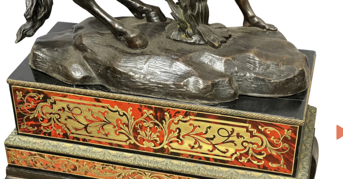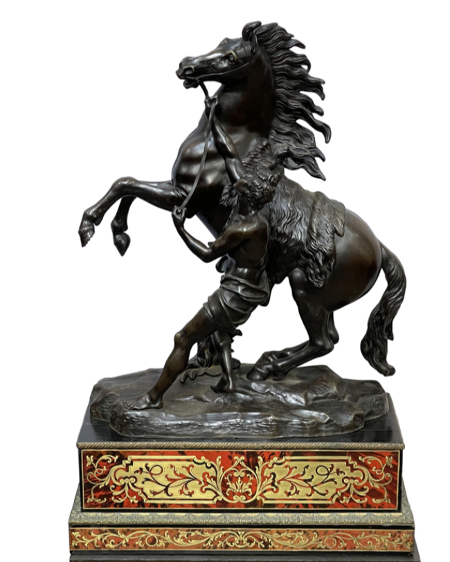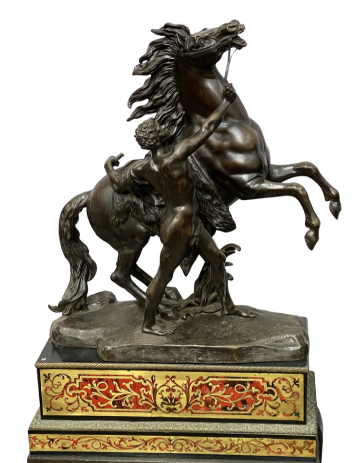 A very large and impressive pair of 19th Century patinated bronze and ormolu Marly horses, after Guillaume Coustou the elder 1677-1746. Mounted on fine French 19th Century Boulle inlaid plinths. 137cm high