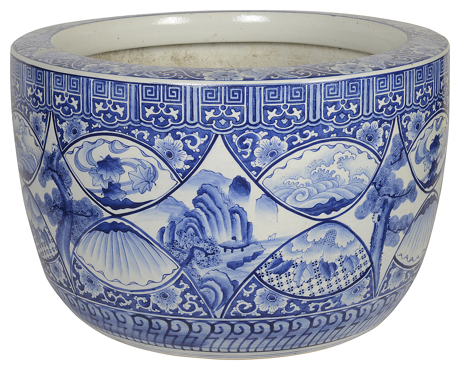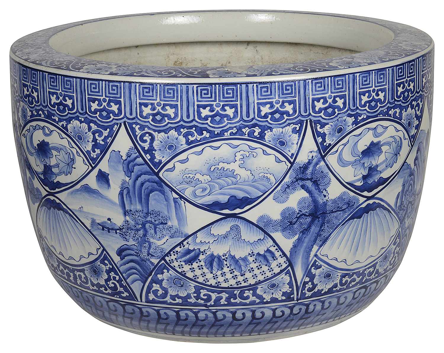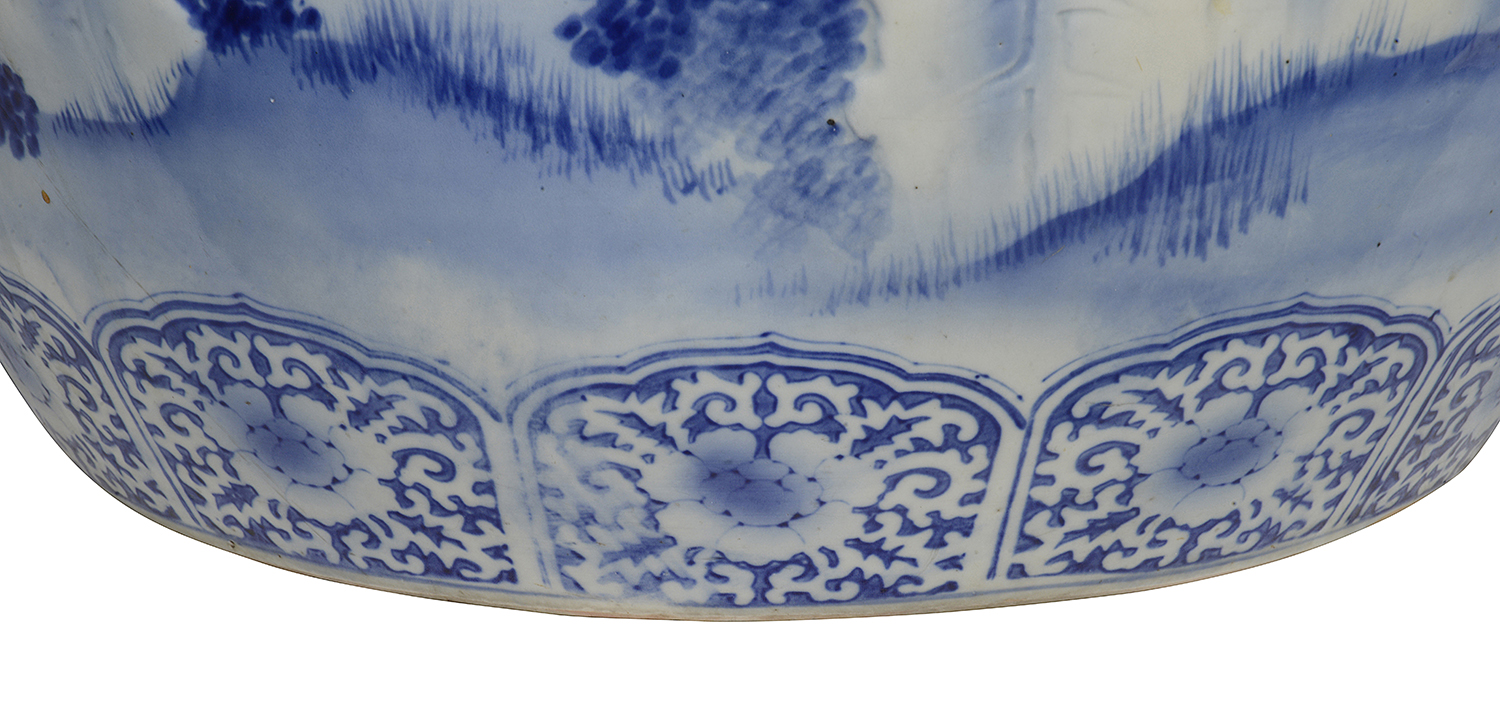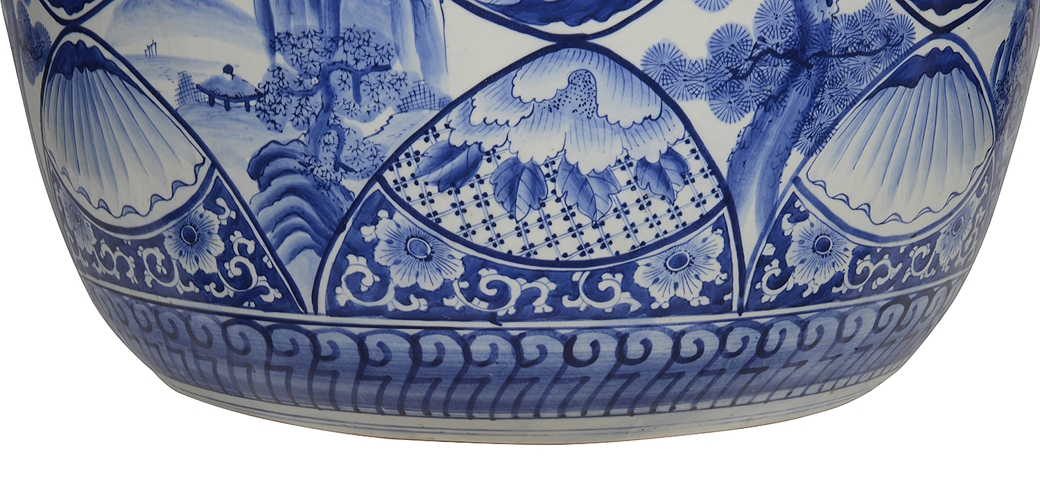 Large Japanese Blue + White jardiniere, circa 1890.