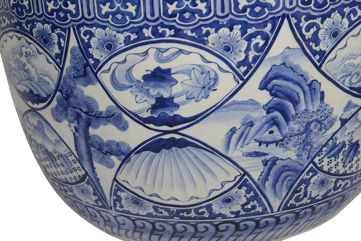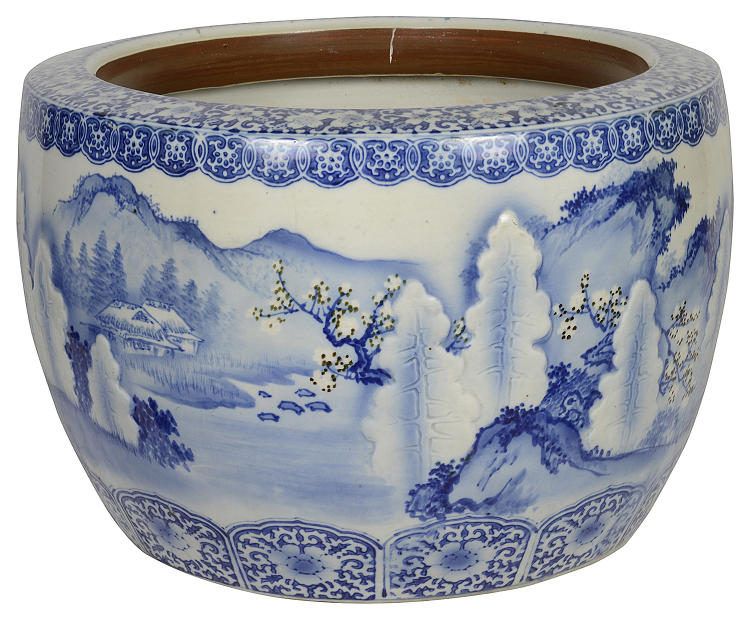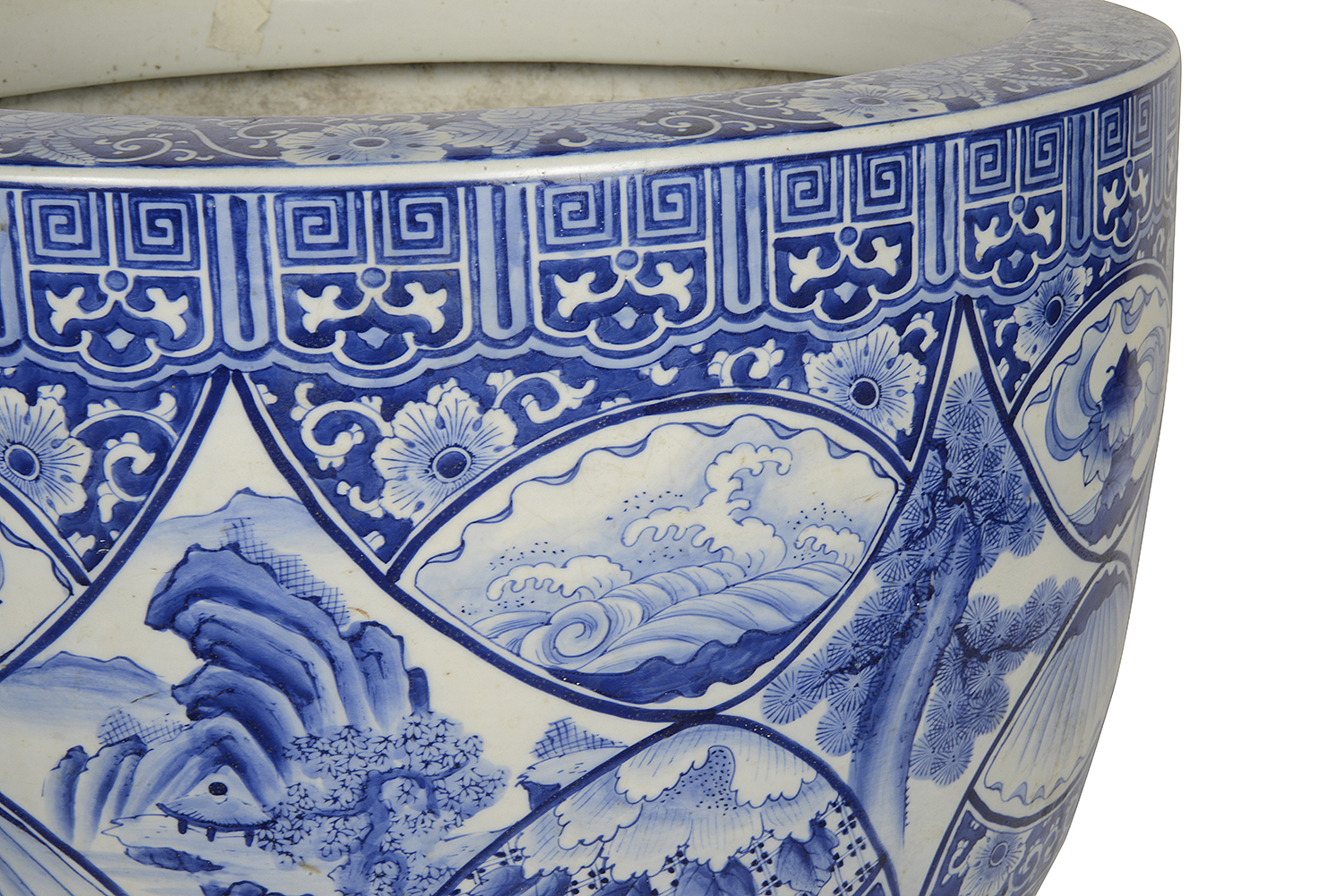 Large Japanese Blue + White jardiniere, circa 1890.