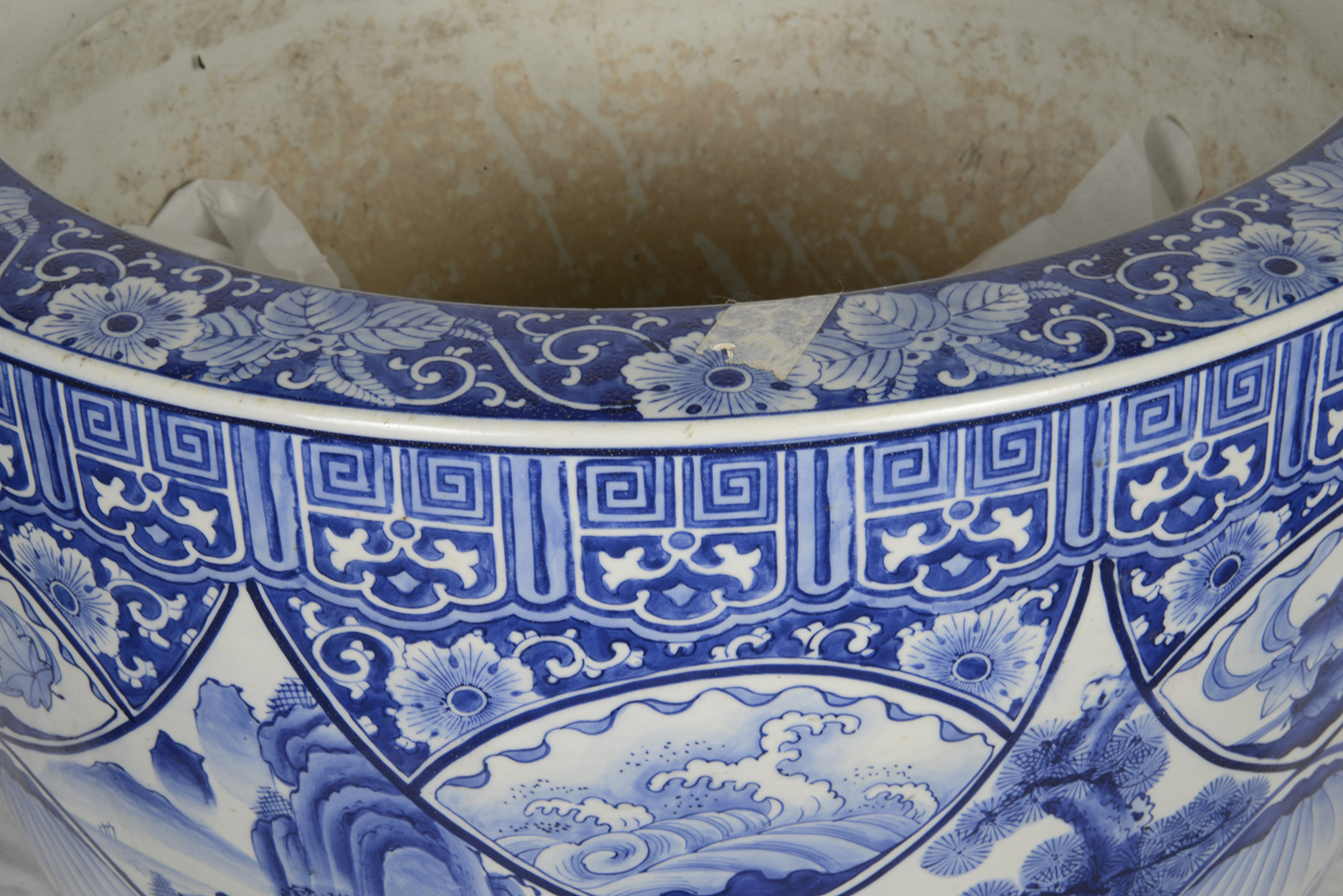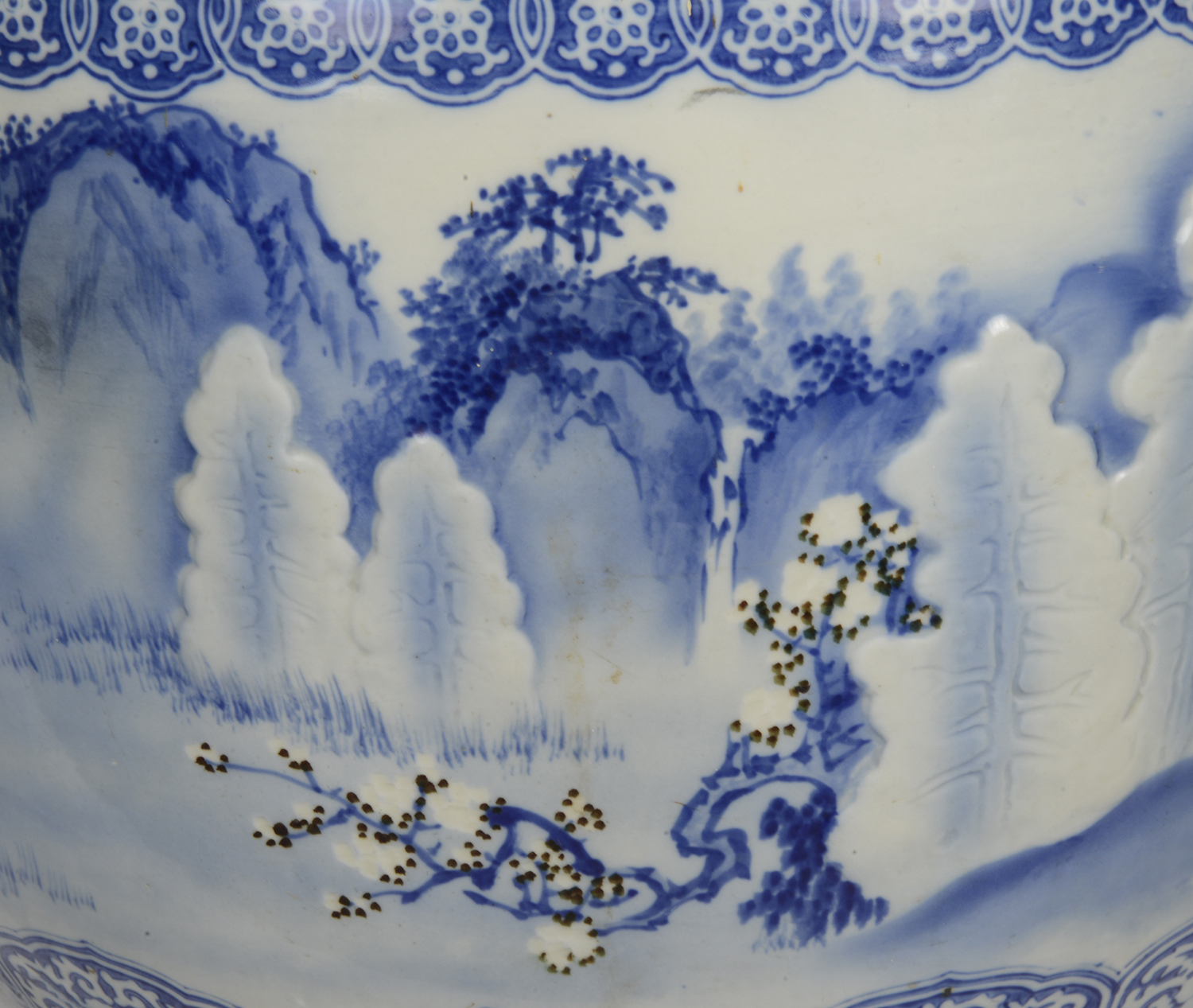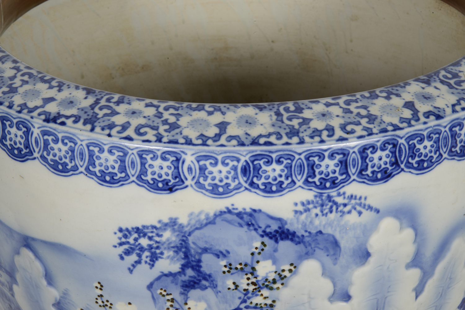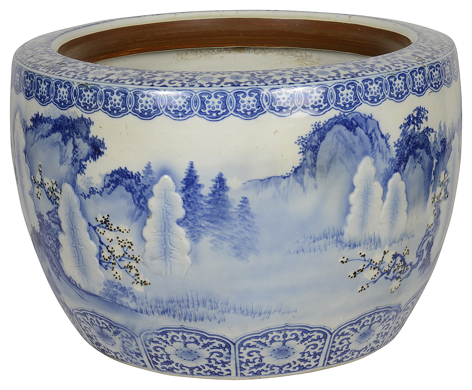Large Japanese Blue + White jardiniere, circa 1890.