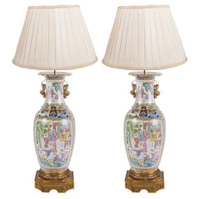 Large Pair of Canton / Rose Medallion Vases or Lamps, 19th Century. Vases 28.35 in. (72 cm) high